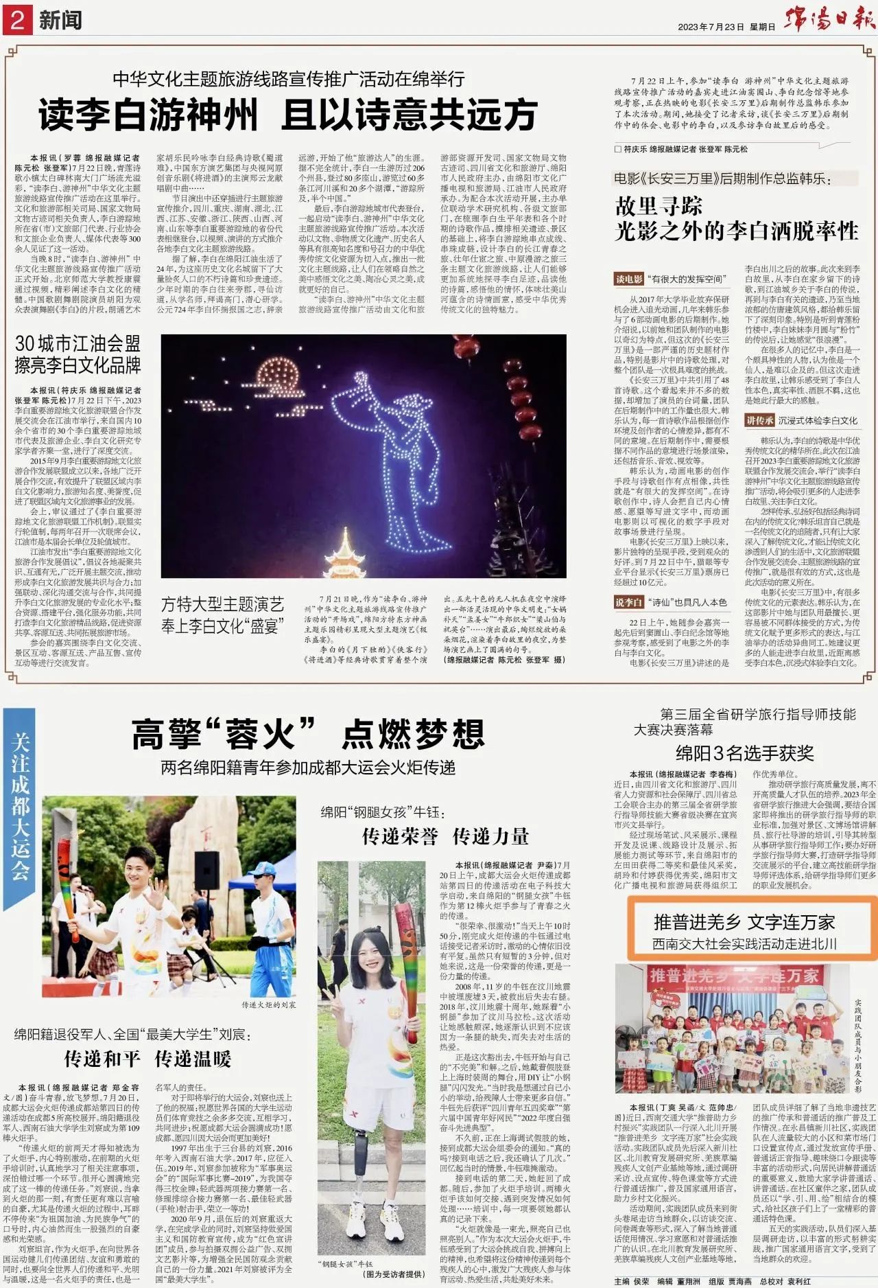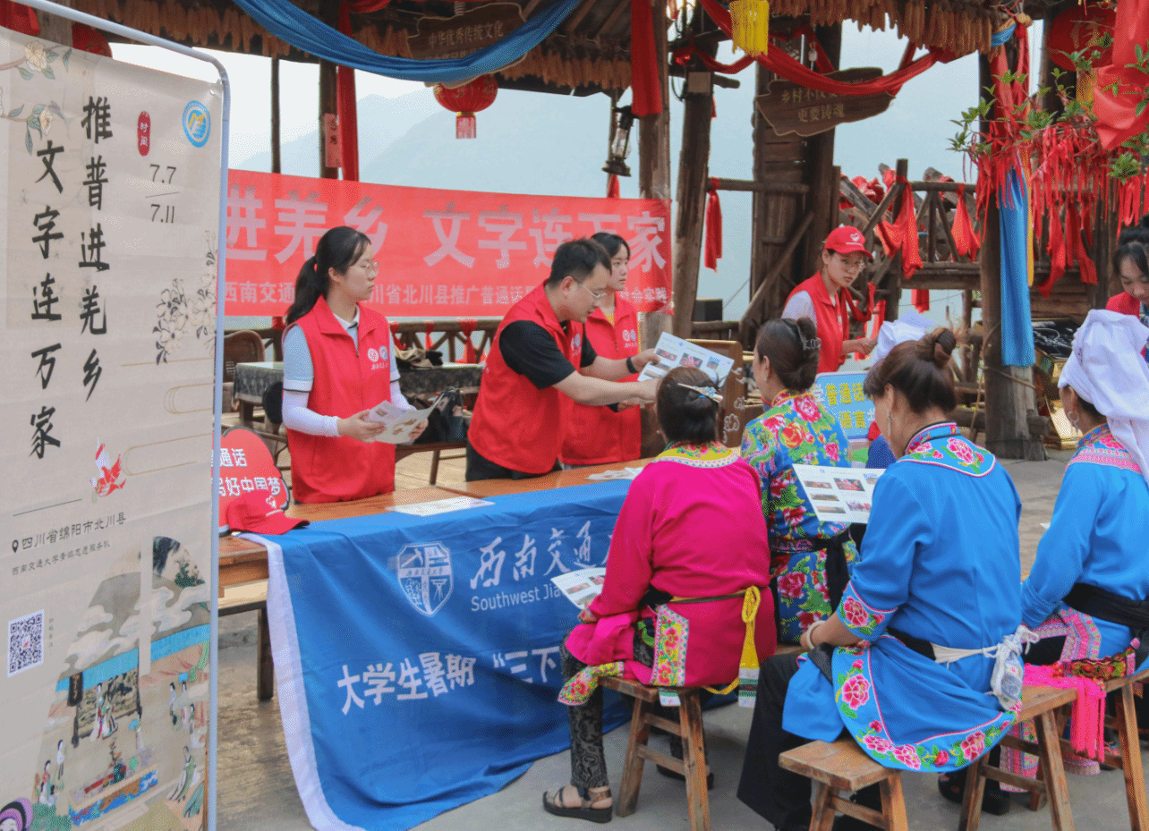 “推普进羌乡,文字连万家”团队8名成员来自青年志愿者协会,由学工组指导老师陈建奇带队,于2023年7月7日至7月11日深入四川省绵阳市北川羌族自治县开展推广普通话志愿服务活动。实践团队深入当地社区,通过走访调研、点位宣传、特色课堂等方式开展普通话调研和推广活动,推进西部少数民族地区语言文字教育,促进中华优秀语言文化传承和发扬,铸牢中华民族共同体意识,为赓续中华文明倾注青年力量,为北川的文化产业发展注入生机活力,以青春之行助力乡村振兴。
