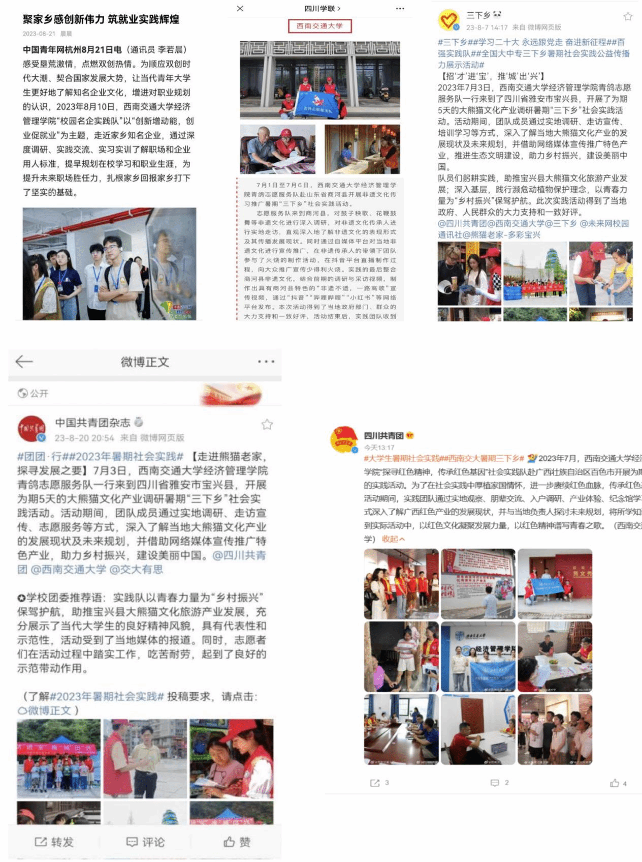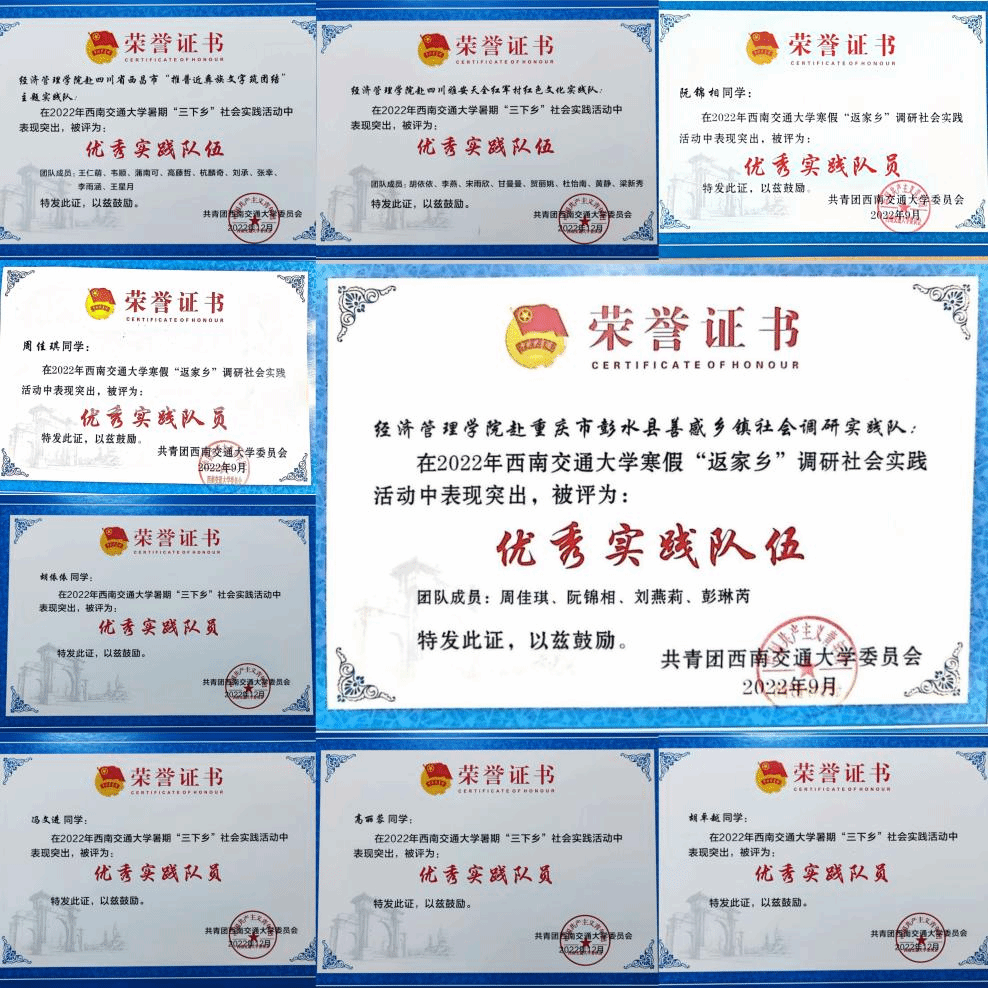 两支大学生暑期“三下乡”团队入选2023年全国大学生暑期社会实践优秀团队,6支队伍获评寒、暑假校级社会实践优秀队伍,19名同学获优秀实践队员,4名老师获学校共青团实践育人优秀指导教师,收到实践地反馈信、感谢信共计20余份。实践队伍获中青校园、中国大学生网、今日头条、中国共青团官方杂志、“三下乡”官方微博等国家级媒体报道27篇,四川法制报、四川学联、四川共青团官方微博等省级媒体报道7篇,以及县、市级等其它报道总计77篇。同时,总结、表彰、宣传,树立典型,强化我院实践育人成效,先后发布我院实践队伍风采展新闻及推送6篇,展现了交大经管学子的良好风貌。