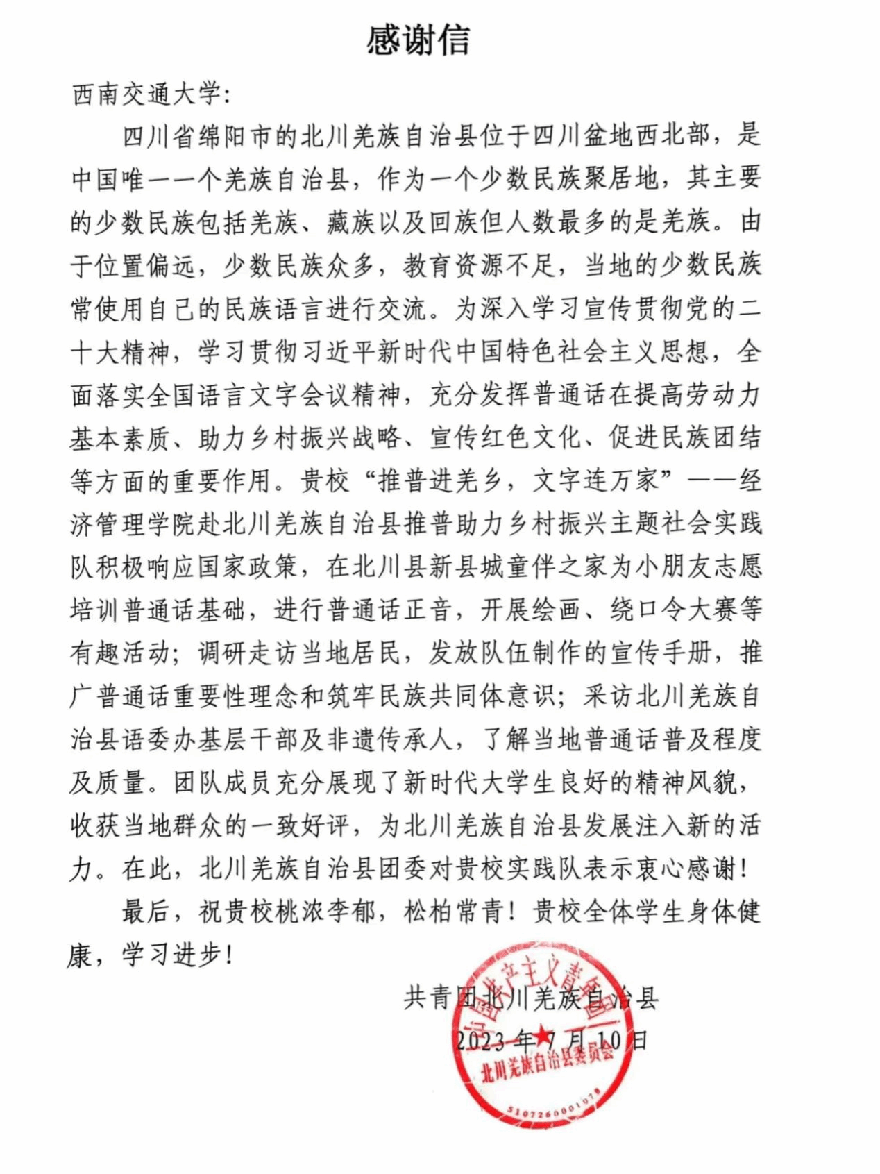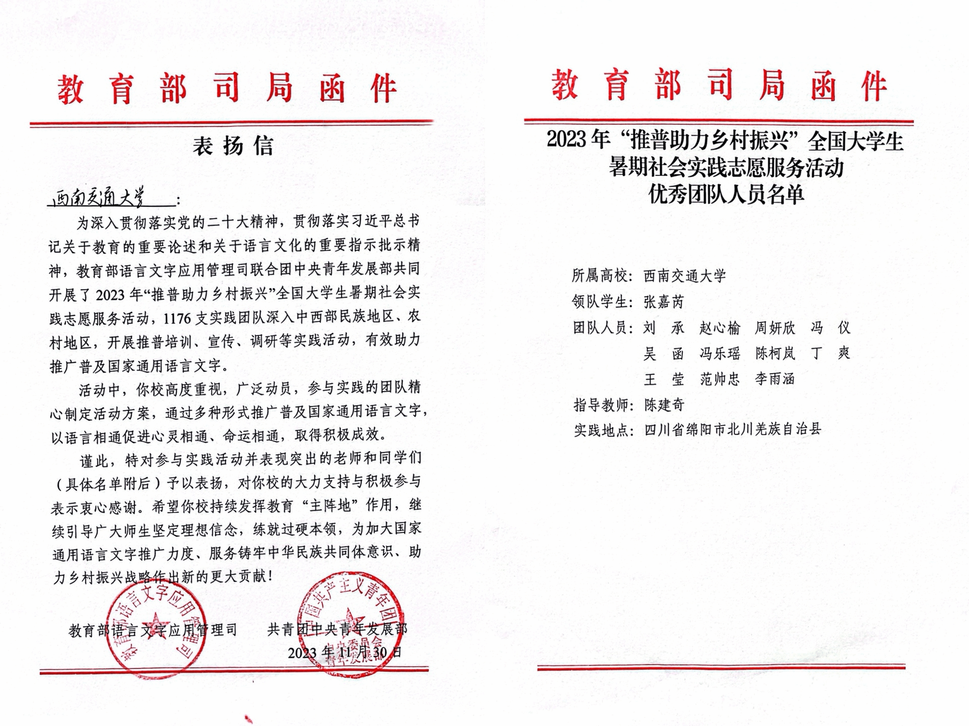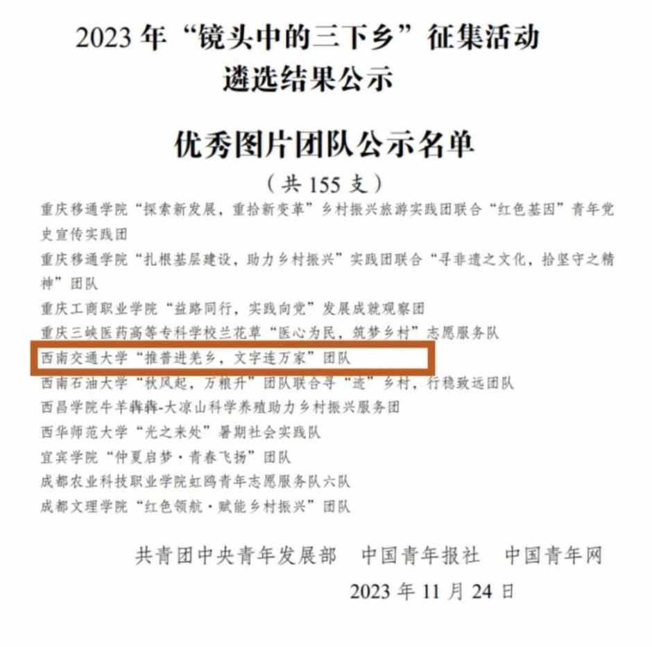 “推普进羌乡,文字连万家”推普助力乡村振兴社会实践队从前期的精心组织、周密安排到中期的督促指导、全面保障再到后期的宣传推广、交流互鉴,通过多种形式推广普及国家通用语言文字,扎实做好每一步工作,取得了积极成效。2023年11月30日团队收到了来自教育部的表扬信!