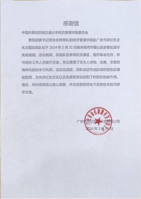 实践队在团委书记贾佳、副书记苏扬老师的带领下,前往四川省广安市开展寒假“返家乡”社会实践活动。实践队首先来到邓小平故里参观调研,感受邓小平同志的伟大人格和崇高精神。参观结束后,实践队成员们分发问卷,与游客亲切交流,收集他们的意见和建议,共同探寻红色文化的深厚底蕴。第二天,实践队继续深入广安,探访了华蓥山。在结束实地参观后,实践队与广安市金亿旅游开发有限公司总经理曾辉开展了研讨座谈会并分享了队伍对广安红色旅游发展的看法。实践活动结束后,团队收到了来自广安市金亿旅游开发有限公司的感谢信。