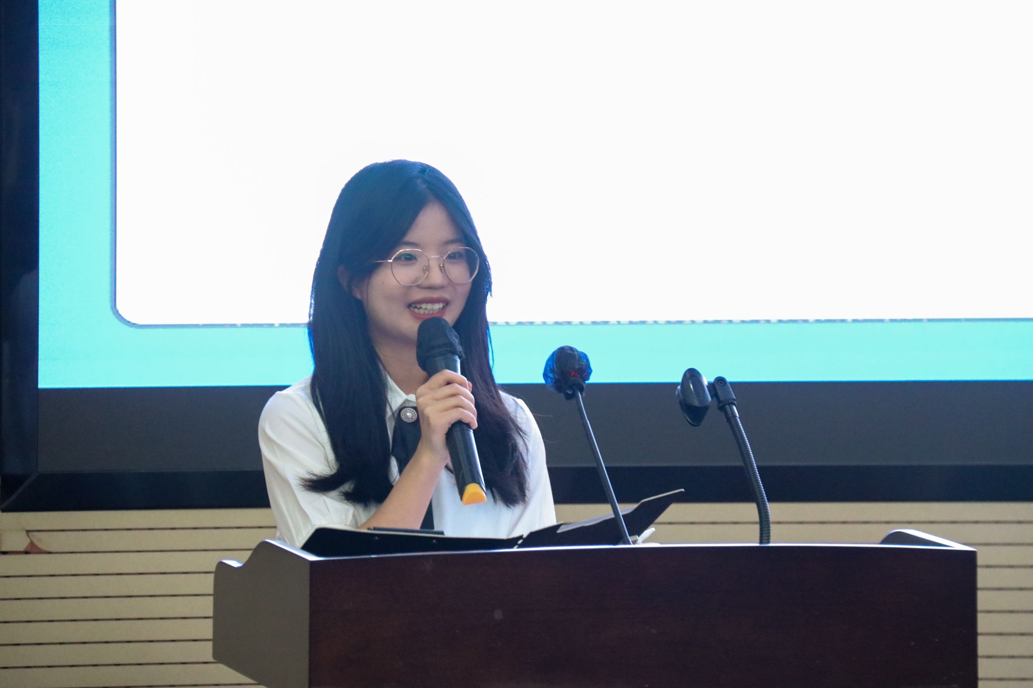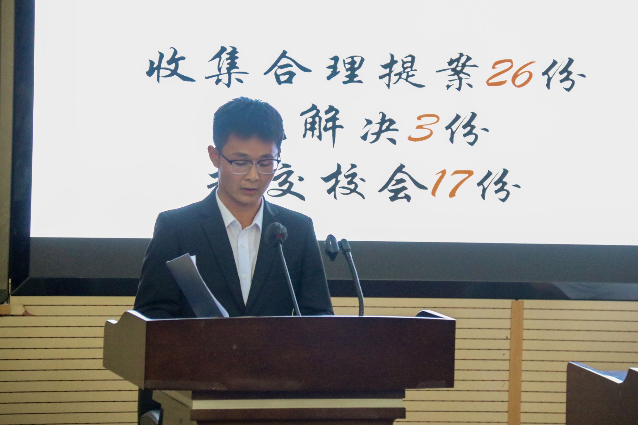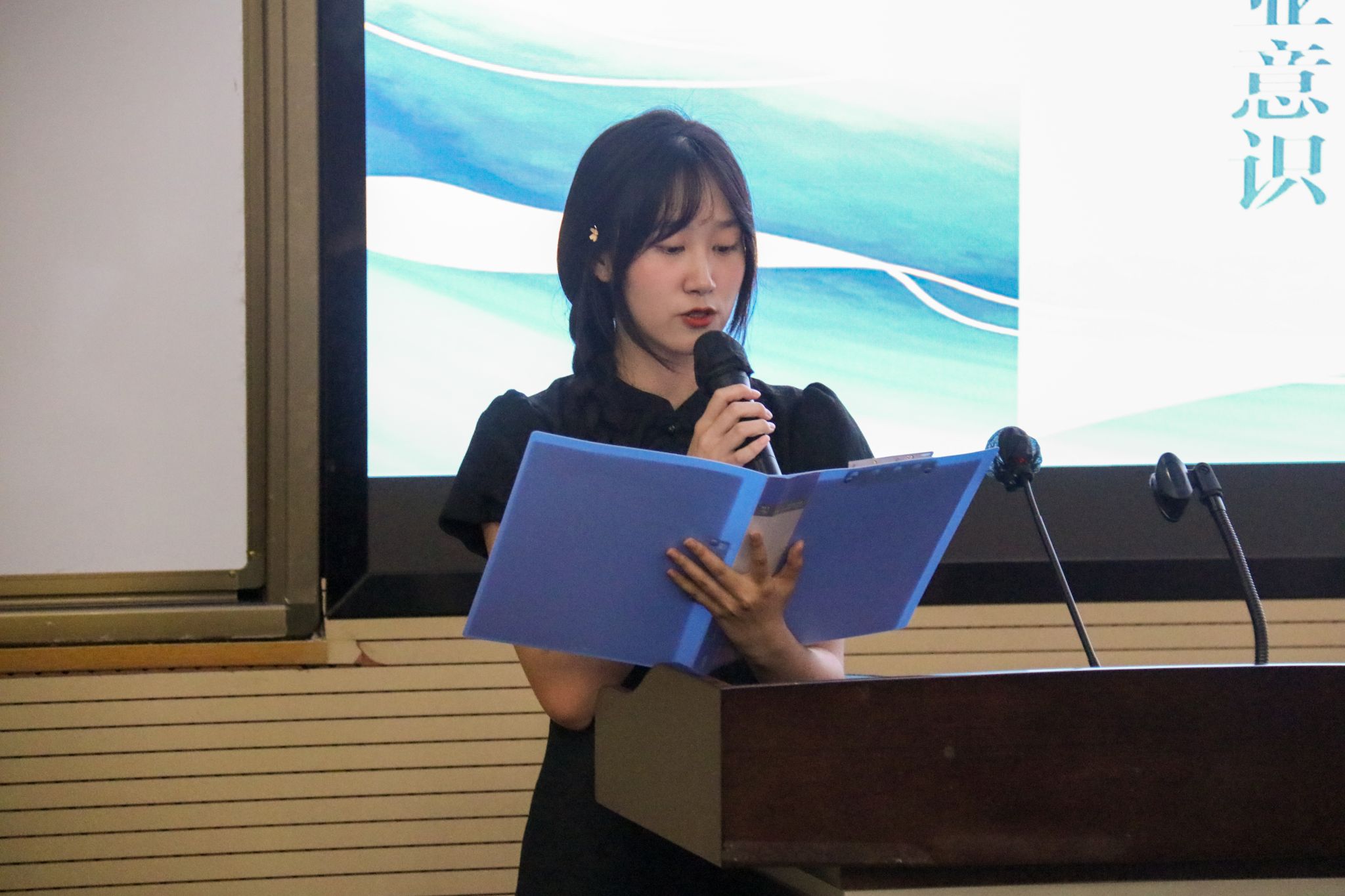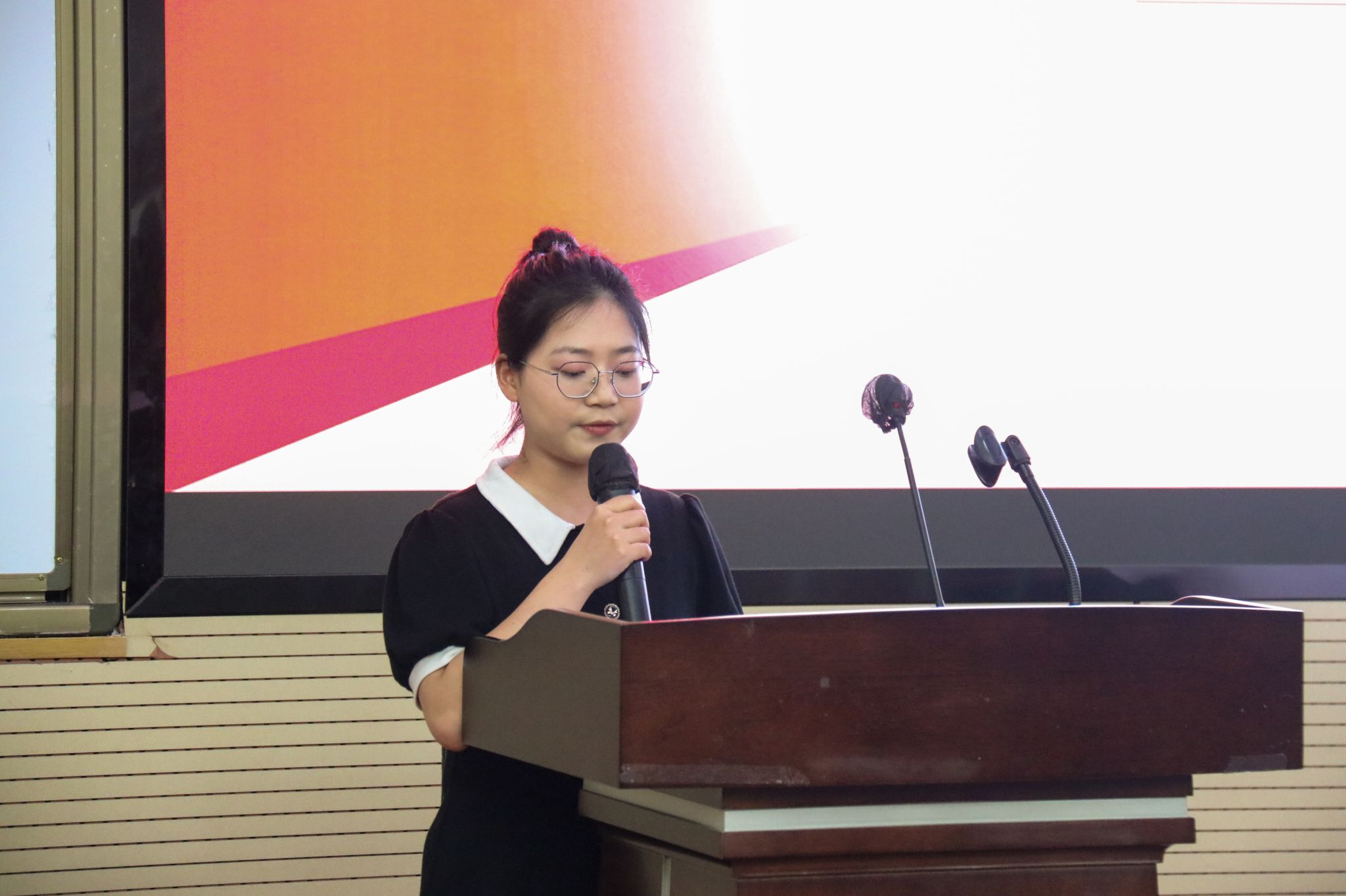 余小英老师为各团学组织主席团成员代表颁发了任职证书并为大会致辞。她对同学们的积极态度和工作表现给予了肯定,同时对新任团学组织干部提出了三点要求:扛起责任、勇于奉献和努力成长。