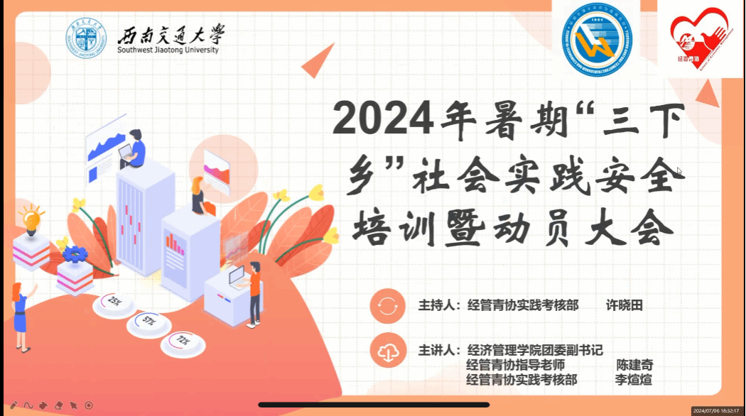 2024年暑期“三下乡”社会实践安全培训暨动员大会在线上举行,学院团委副书记陈建奇、青年志愿者协会干部以及27支校级、院级以及专项队伍一起参加了大会。
