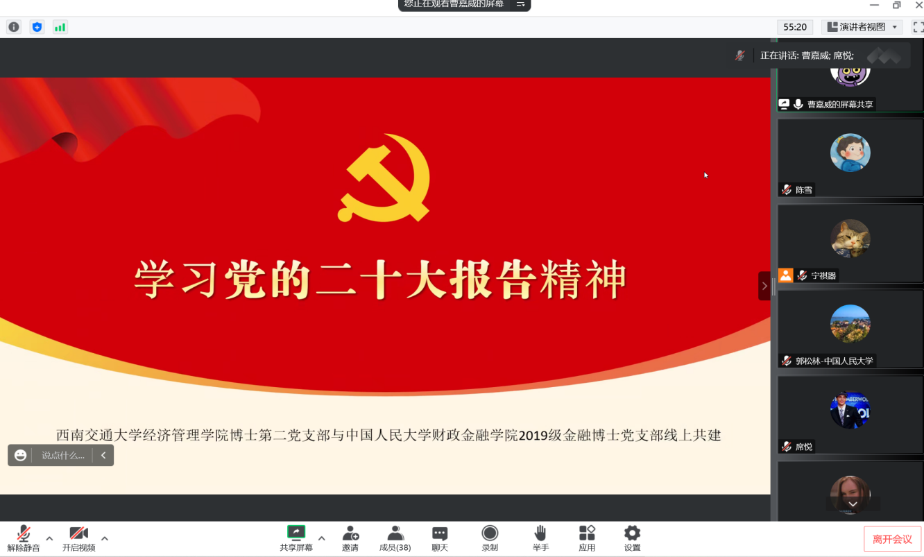 博士第二党支部和中国人民大学财政金融学院2019级金融博士党支部共四十多名学生党员举行线上党支部共建主题党日活动,深入学习和领悟党的二十大精神。活动由色色啦