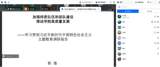工程管理系党支部于2023年7月30日在线开展了主题教育专题党课活动。学院党委委员、执行院长郭强同志讲授有关“加强师资队伍和团队建设 推动学院高质量发展”的专题党课。工程管理系党支部全体党员及部分非党员教师一起参加了学习。