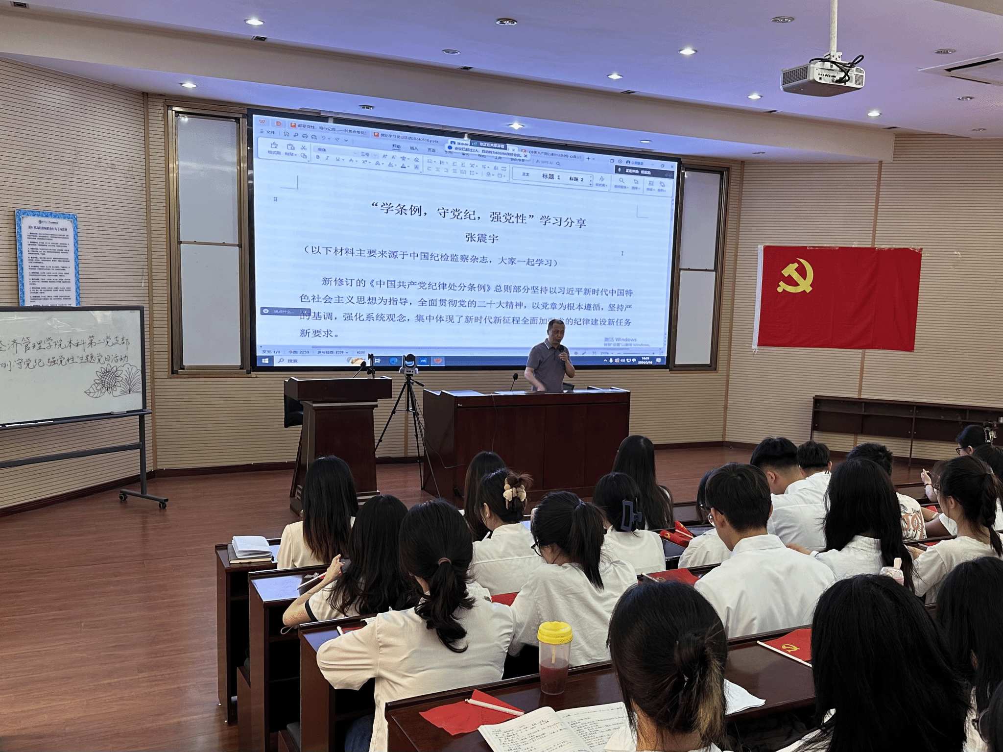 本科第二党支部在信息楼0202教室开展党纪学习教育—“学条例,守党纪,强党性”主题党日活动,以促进广大党员深刻学习领悟《中国共产党纪律处分条例》,切实做到知纪于心,立纪于身,化纪于行,推动党纪学习教育入脑入心,走深走实。本次活动特别邀请到学院纪委副书记张震宇老师到场进行学习分享。