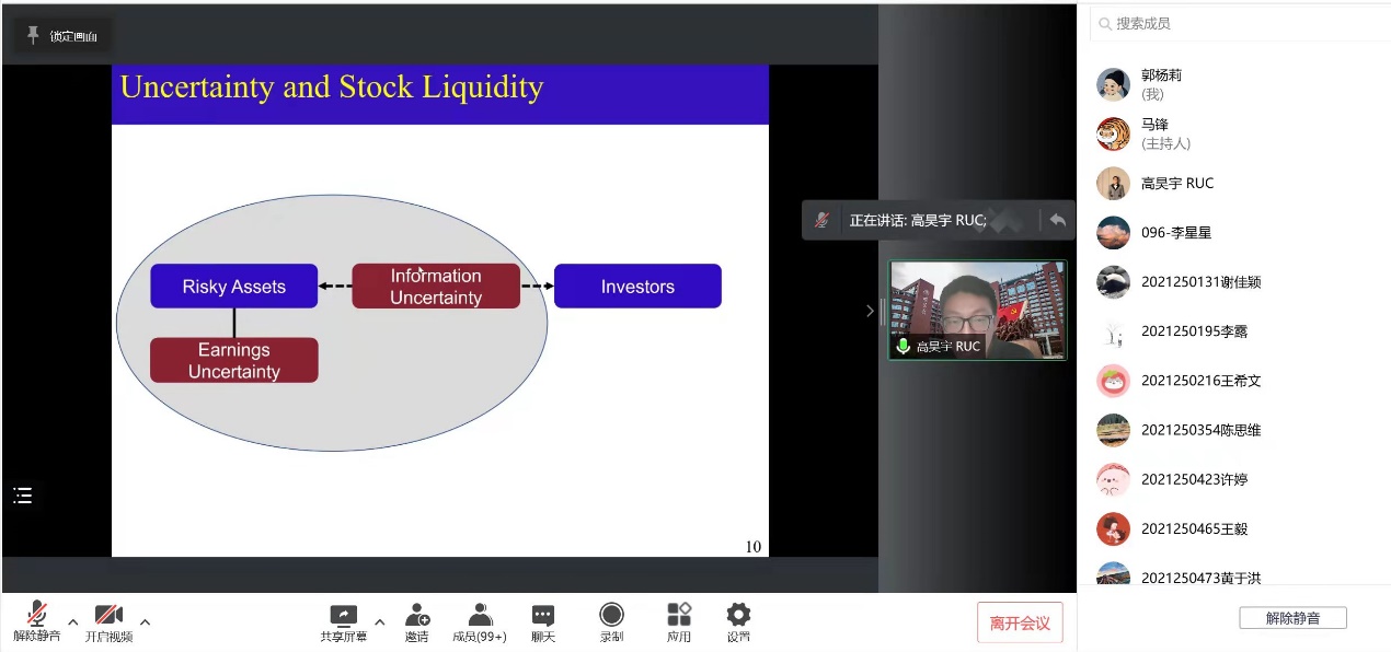 随后,高昊宇副教授对相关文献进行了梳理,从理论角度提出了流动性的两种影响机制。高昊宇介绍了实证部分的研究思路。通过实证研究发现,疫情所带来的相当大的不确定性造成了股票流动性的显著枯竭。同时也证明了之前关于不确定性影响股票流动性的两种理论假设。此外,通过一系列稳健性检验,排除了公司受到其他因素的影响(如其他不确定性事件,交易限制,市场情绪,风险厌恶),证明了新冠疫情带来的不确定性会造成公司股票流动性下降。