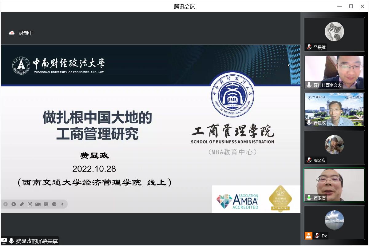 2022年10月28日19:00,中南财经政法大学工商管理学院副院长费显政教授应邀为学院师生带来题为“做扎根中国大地的工商管理研究”的线上讲座。本次学术活动由市场学系蒋玉石教授主持,校内外师生80余人参加了本次讲座。