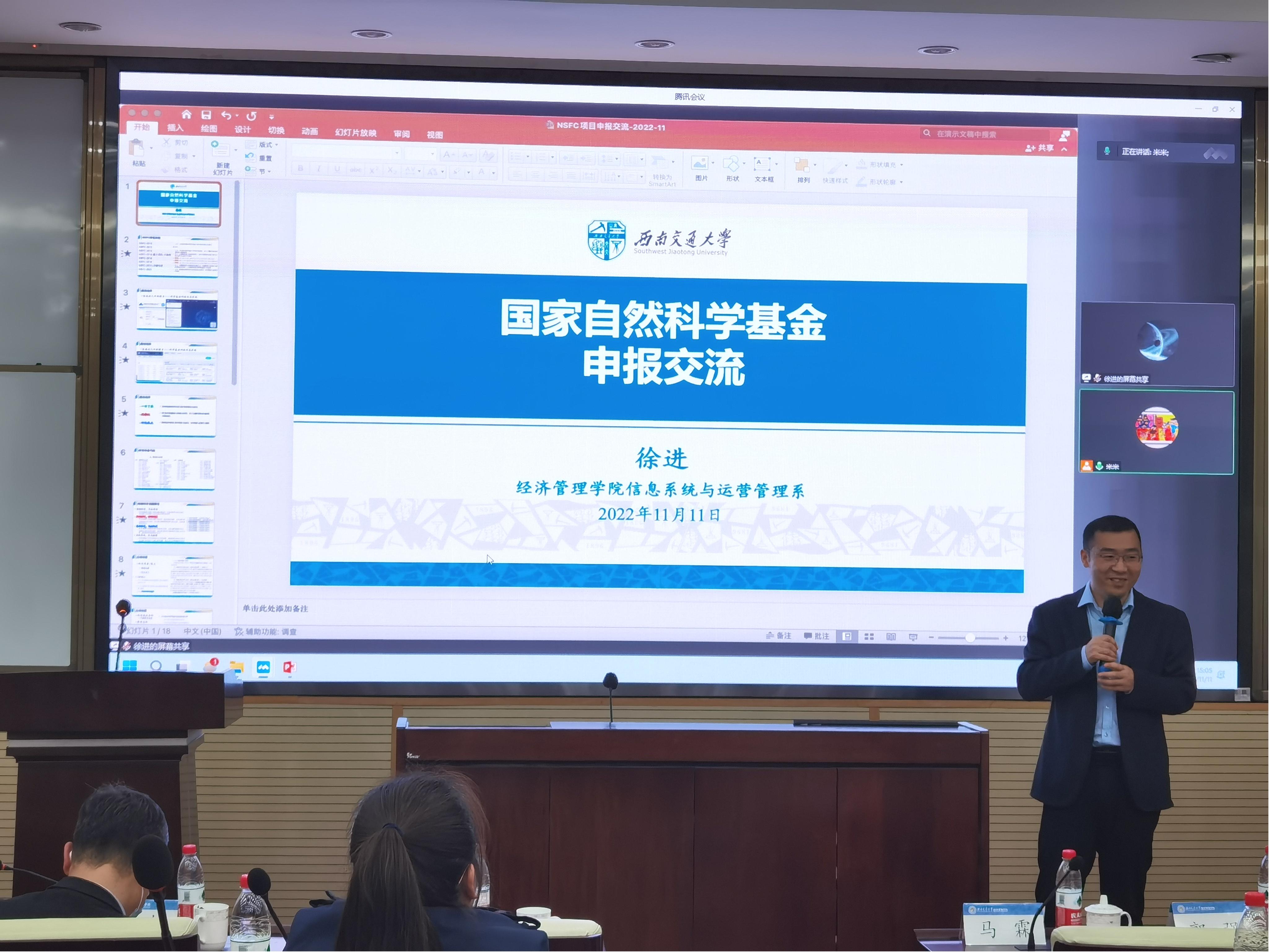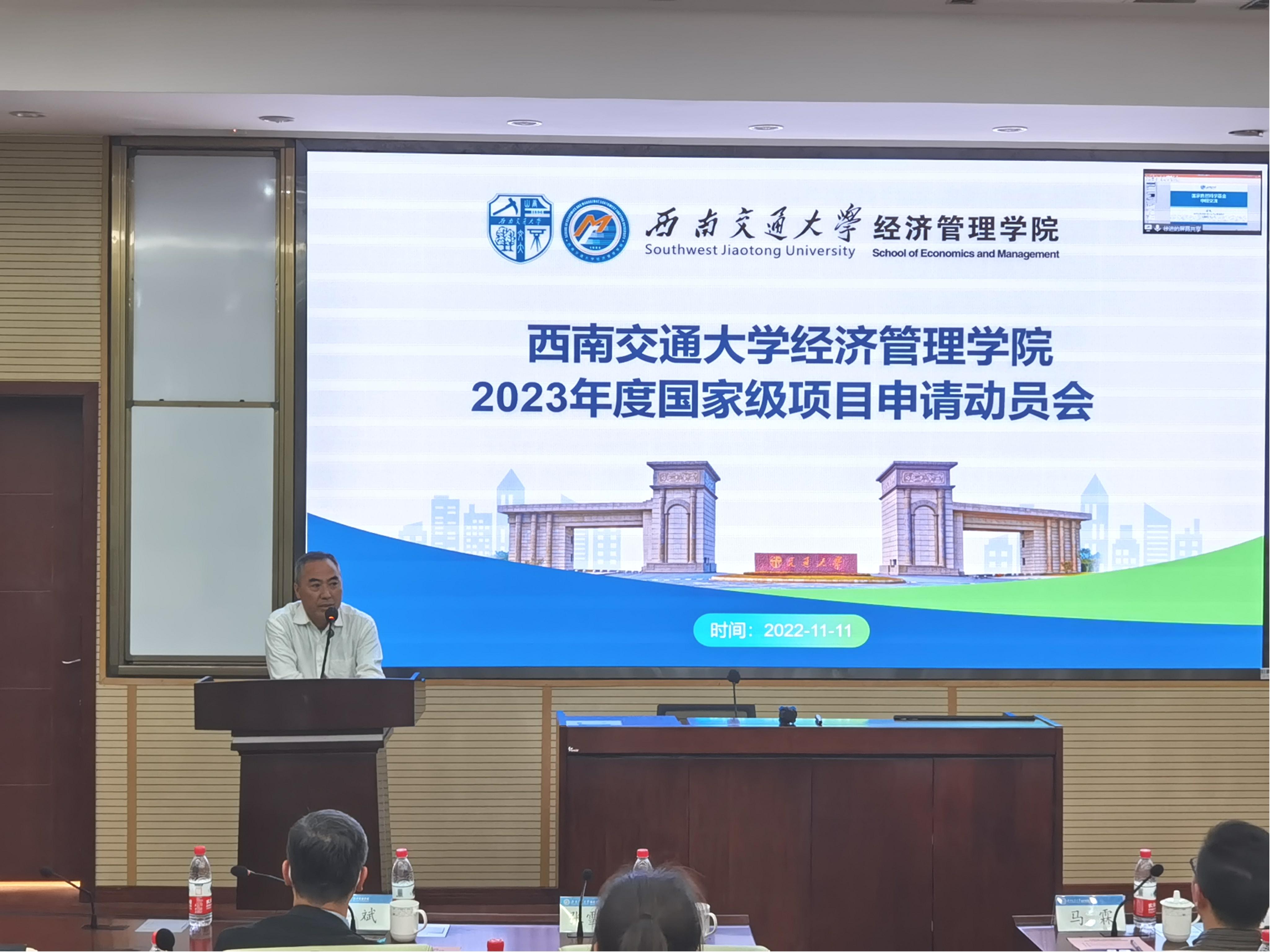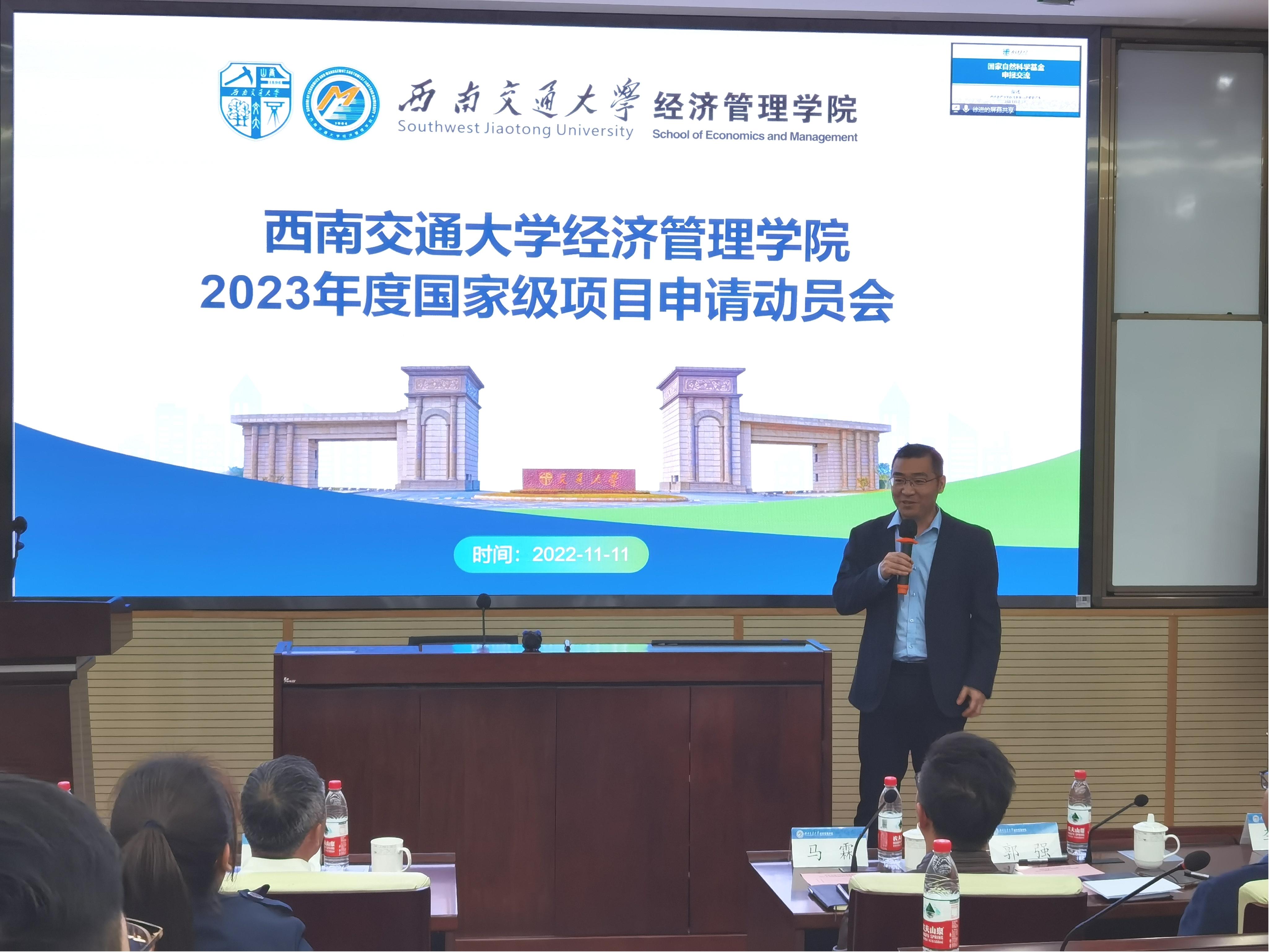 近期,学院组织开展一系列科研活动助力老师们申请申报各类科研项目。2023年度国家级科研项目申报动员会2022年11月11日下午在九里校区0212室举行,学院特邀请文科建设处处长张雪永、科学技术研究院副院长马霖出席。动员会由学院副院长聂佳佳主持,学院党委书记王斌、执行院长郭强等全院40余名老师参加。