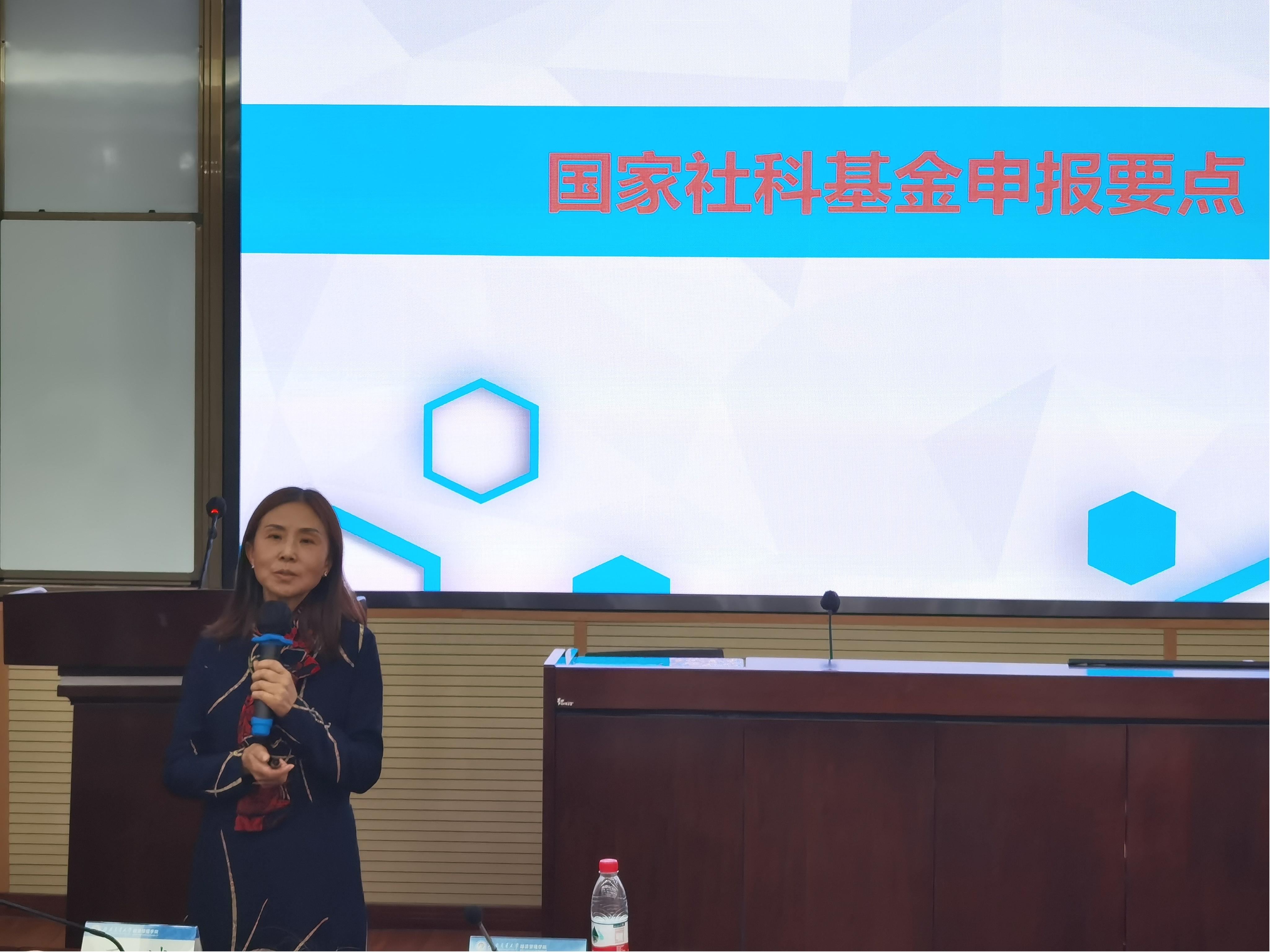 李杰老师结合自己多年来在社科基金项目申报中的体会分享了国家社科基金申报的经验。李杰老师从申报书的撰写、注意事项、评审程序三个方面进行了讲述。她在申报书的撰写部分强调了选题需紧贴国家大政方针及重点政策导向,项目成员构成要合理,预期成果、课题论证、思路方法、研究可行性等方面要更加注意相应的写法和细节。