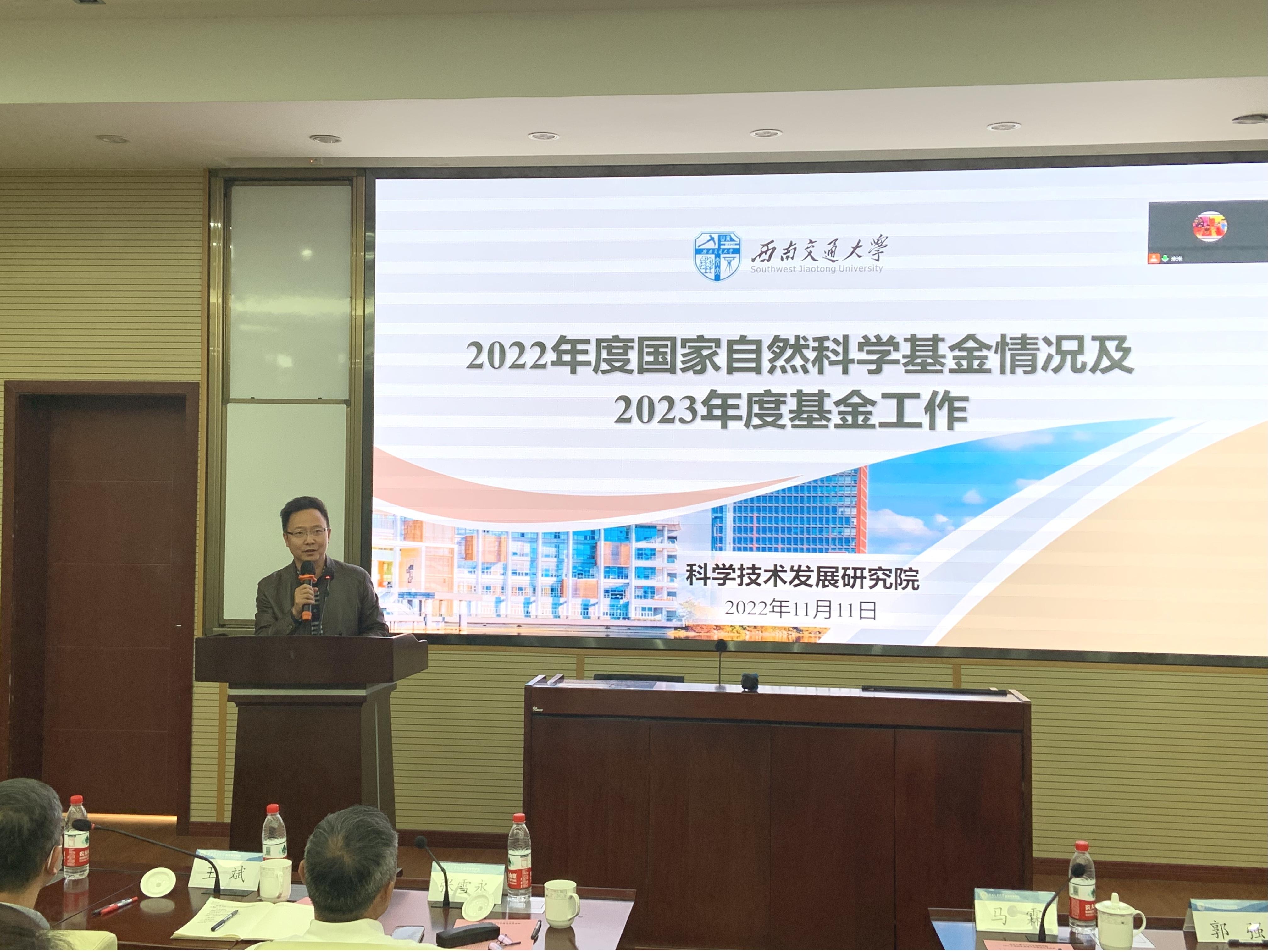 马霖副院长介绍了学校2022年度自然科学基金项目申报获批、申报注意事项、2023年自然科学基金项目申报等有关工作情况,重点介绍学校自然科学基金项目申报的总体现状、国家自然科学基金项目申报计划等,建议老师们一定要积极申报、持续投入,学校将在2023年国家自然科学基金项目申报工作中的每个申报阶段实施相应的“帮扶制”、“预审制”计划,形成“校-院-团队”三级申报指导帮扶模式,助力学院老师们的申报工作,希望老师们来年获得好成效。