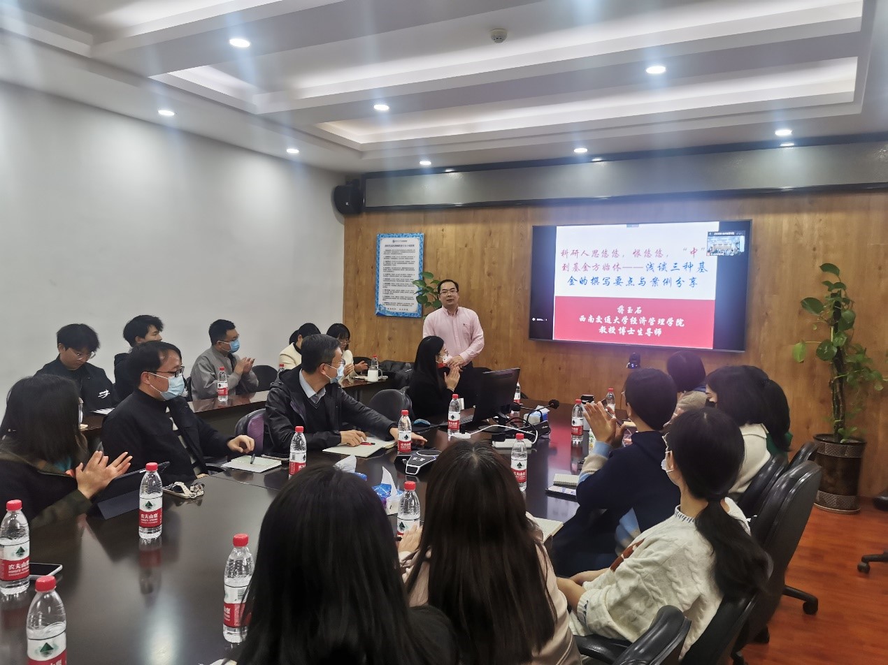 党委书记王斌主持,我院市场学系蒋玉石教授分享了申报教育部人文社科基金、国家社会科学基金和国家自然科学基金项目的经验。