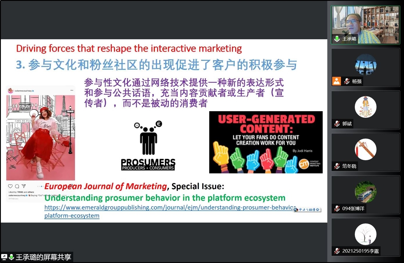 王承璐教授梳理了互动营销的发展历程,他提出,互动营销是通过积极的客户联系、参与和互动进行双向价值创造和交流的过程。互动营销随着互联网和电子商务的广泛应用迅速发展,技术进步提供了推动互动营销发展的实用工具,而电商和社交媒体平台革命正在重塑新的商务生态系统,从而促进企业和客户联系和互动。随后,王承璐教授从社交媒体、直播商务、虚拟现实、粉丝社区等研究领域向我院师生分析了互动营销领域具体的商业应用场景和学术研究主题。
