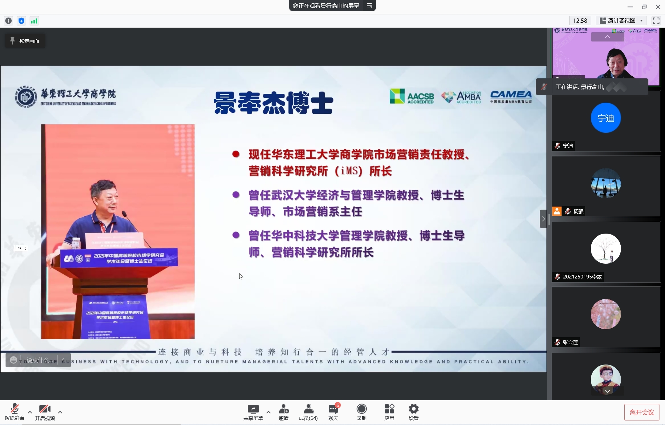 46日上午9:30,华东理工大学商学院景奉杰教授学术讲座在线上举行,景奉杰教授以“洞察先机,超越实践,开展助力良性经营决策和教育教学的研究”为主题进行了精彩的分享。本次学术活动由学院市场学系蒋玉石教授主持,学院执行院长郭强教授以及学院部分教师、九十余名研究生在线参加了本次讲座。