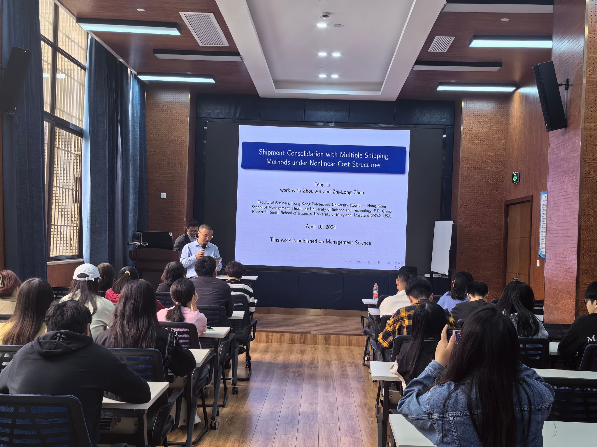 本次讲座专注于“基于非线性费用函数下多运输模式的订单匹配问题”的这一研究的分享。李锋教授首先以宝武钢铁和良品铺子这两个企业的货物运输模式,引出了本文研究的主题——多运输模式下的订单匹配问题。同时还介绍了中国邮政速递和联邦快递两个企业的运输收费模式——增量折扣和总量折扣,借此引出了本研究的另一主题——非线性运输费用。最后介绍了文章的创新点,只关注与装运合并相关的决策、运输方式和运输成本等的定义更一般化和研究更理论化。