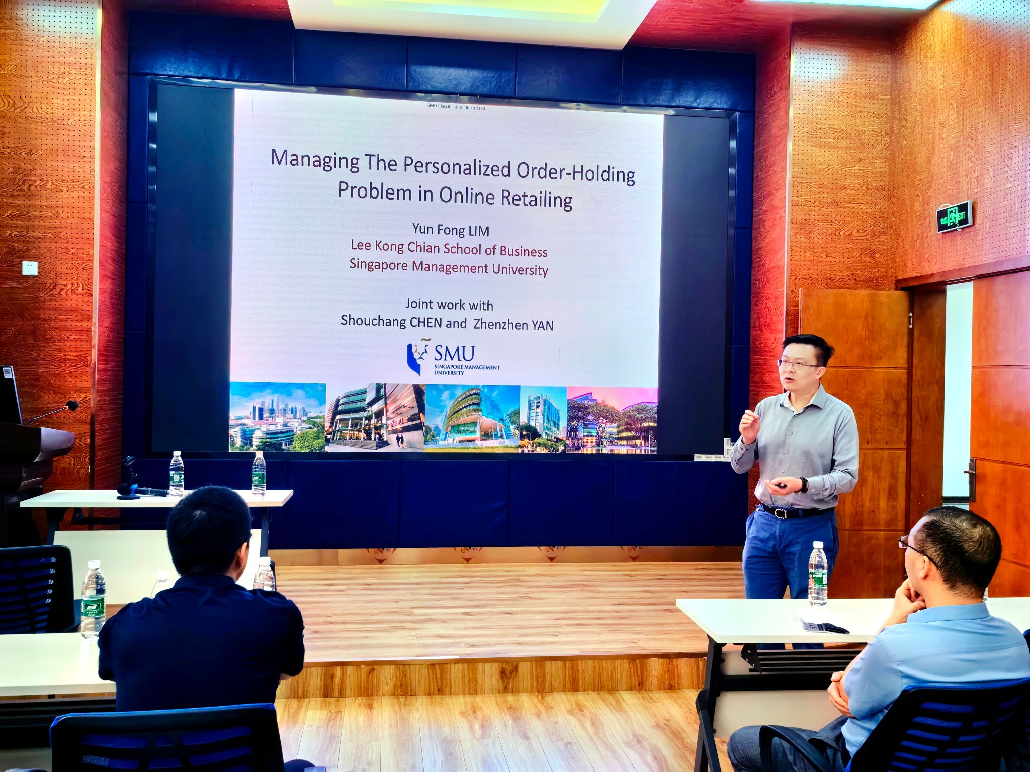 2024年4月25日新加坡管理大学林云峰教授应邀在学院0218室为我院师生作了题为“Managing The Personalized Order-Holding Problem in Online Retailing”的学术讲座。本次学术活动由学院副院长聂佳佳教授主持,学院院长韩科及部分教师、研究生参加了此次学术活动。聂佳佳教授首先对林云峰教授的学术成果进行了介绍,同时对林云峰教授的到来表示真挚的感谢!