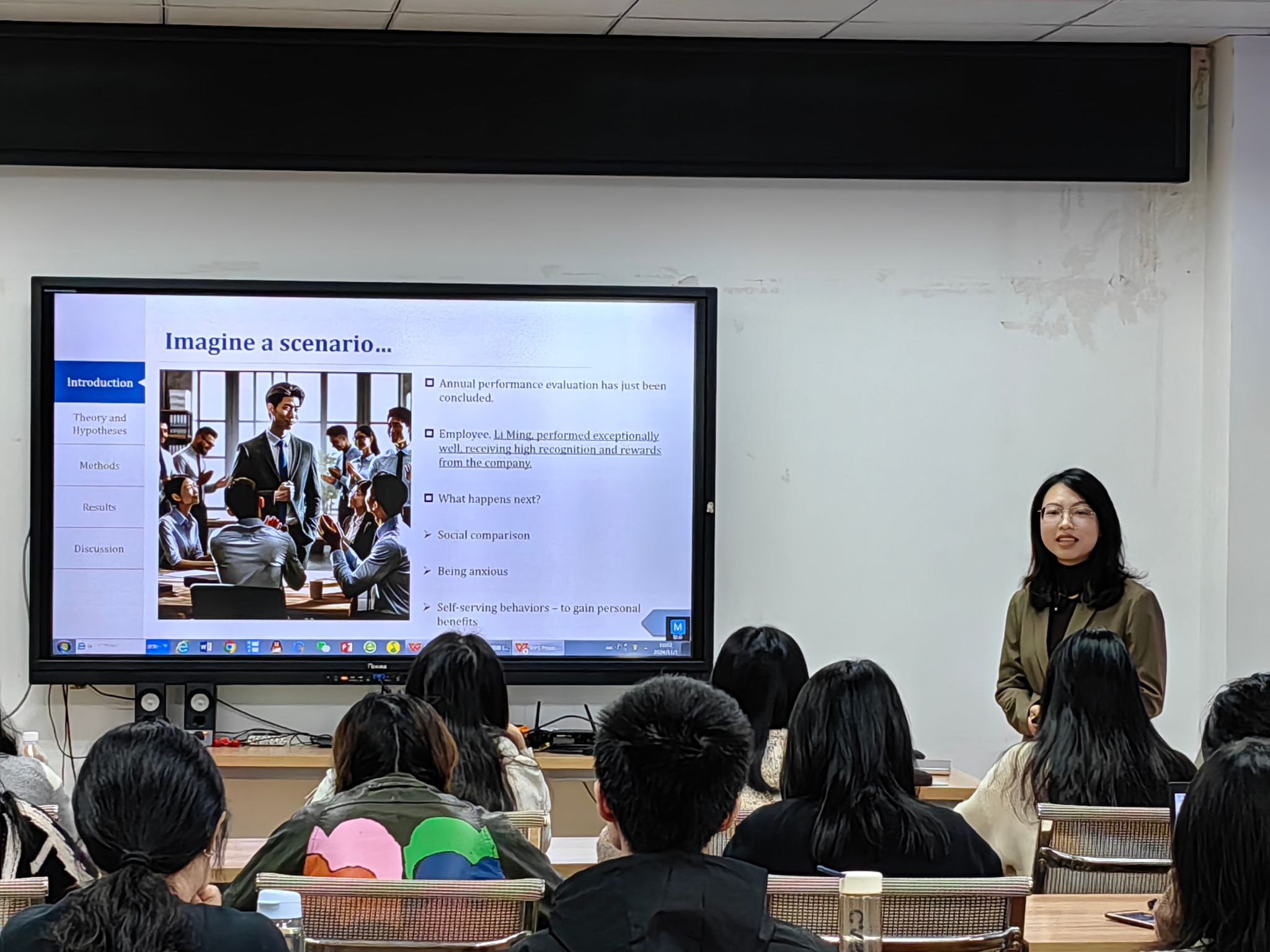 讲座伊始,彭艳博士深入浅出地介绍了职场中高绩效社会比较的现象。她指出,尽管企业普遍鼓励员工提升绩效以促进组织发展,但目前对于高绩效在职场中的社交比较影响仍缺乏深入了解。基于社会比较理论,彭博士的研究提出了一个解释框架,探讨员工在看到他人表现优异时产生的焦虑感,以及这种焦虑如何驱使他们采取保护自身利益的政治性行为。