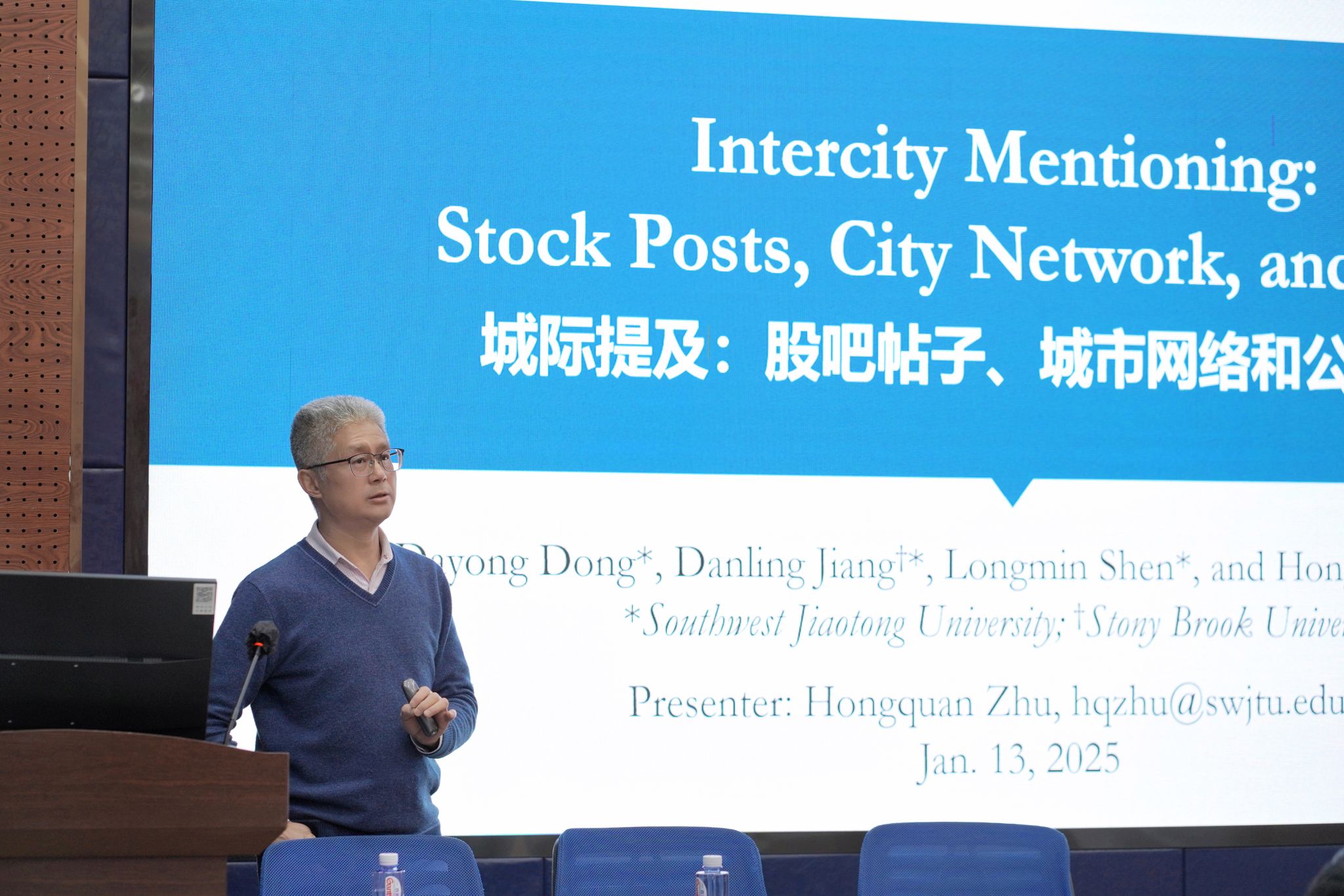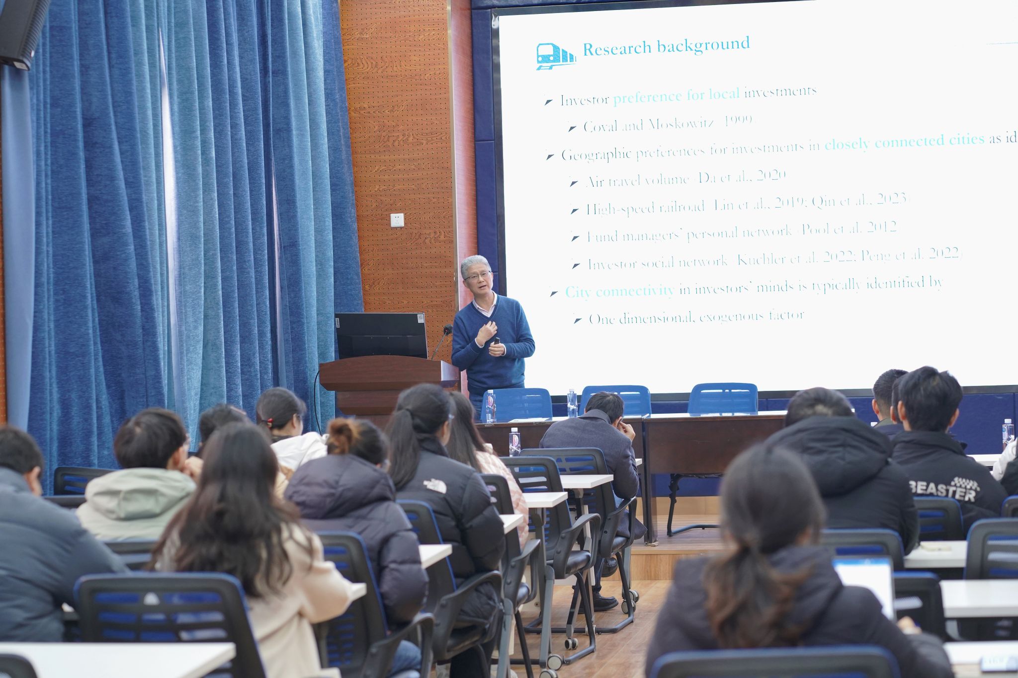 举办了师道永传,匠心筑梦——资深教师系列讲座,本次讲座特邀学院的朱宏泉教授作为主讲嘉宾,围绕“Intercity Mentioning: Stock Posts, City Network, and Firms(城际提及:股市帖子、城市网络与企业)”这一主题展开。本次学术活动由金融与财务学系主任董大勇教授主持,董大勇教授向与会者介绍了朱宏泉教授的学术背景及其在该领域的贡献,并对朱教授的分享表达了诚挚地感谢。