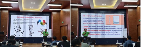 紧接着,王承璐教授通过几个正确与错误案例的对比示范,让在座师生深刻了解到研究者应将新信息和对现象的理解融入具有理论基础的、引人共鸣的故事中。作者需要以逻辑清晰且令人信服的方式阐述其贡献。同时,在讲故事中能够通过回答“有何意义?”“那又怎样?”“为何重要?”等关键问题,揭示数据背后隐藏的意义。