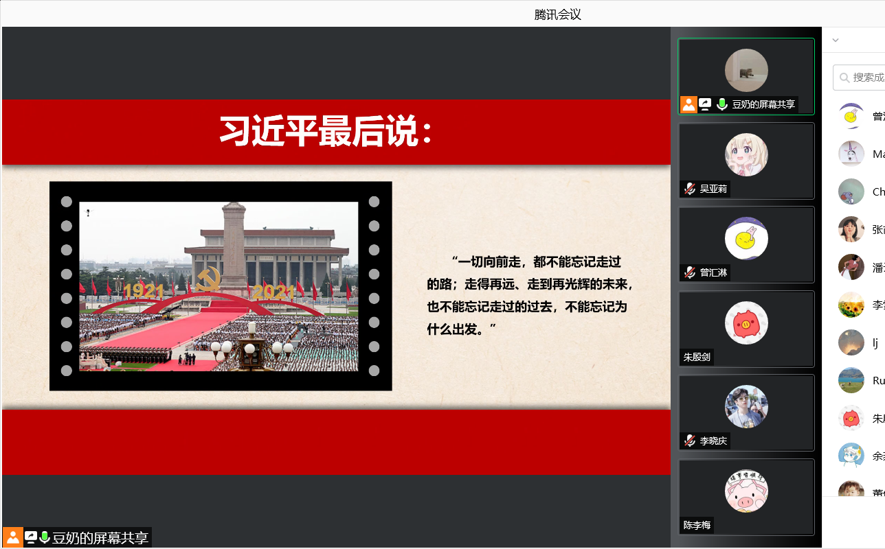 会议接近尾声,曲芯雨同志引用习近平总书记的一句话,“一切向前走,都不能忘记走过的路;走得再远、走到再光辉的未来,也不能忘记走过的过去,不能忘记为什么出发”,期望大家始终牢记初心使命,深入领会伟大精神,努力克服未来道路上的困难,为国家的发展贡献自己的力量。