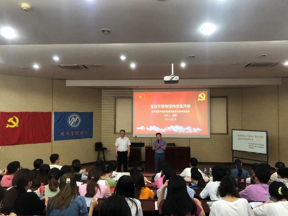 执行院长郭强同志以“坚定不移地坚持改革开放”为主题,讲授了庆祝建党百年专题微党课。参加本次党课的有学院本科经贸类党支部成员、2018级博士党支部和工程管理系教工支部成员。