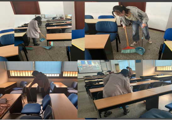 在支部书记孔君的带领下,我们先是从打扫课后教室的卫生做起,帮助楼层管理人员上课后的教室进行清扫。
