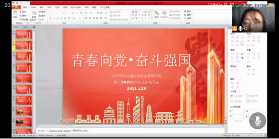 硕士2019级第四党支部依托腾讯会议平台开展了线上党组织生活会。本次会议以“青春向党·奋斗强国”为主题,由邹嘉瑞同志主持,旨在带领大家回顾与学习中国共产党的光辉历程,调动全体党员学习党史的积极性。