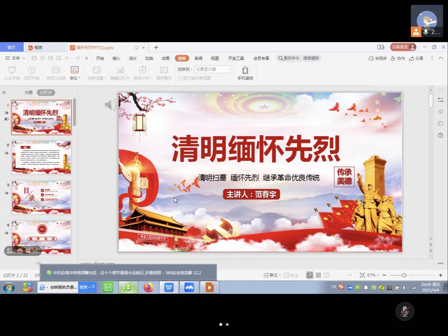 接下来主讲人为我们播放了近期中印边境对峙的视频。可以清晰的看到,冲突发生后,中方为维护两国两军关系大局,推动局势降温缓和,保持了高度克制,体现了中国作为负责人大国的气度担当。此时冲突中,我方牺牲四名官兵,中国崇敬烈士,更珍惜生命,在清明之际,再度回顾缅怀四名先烈。