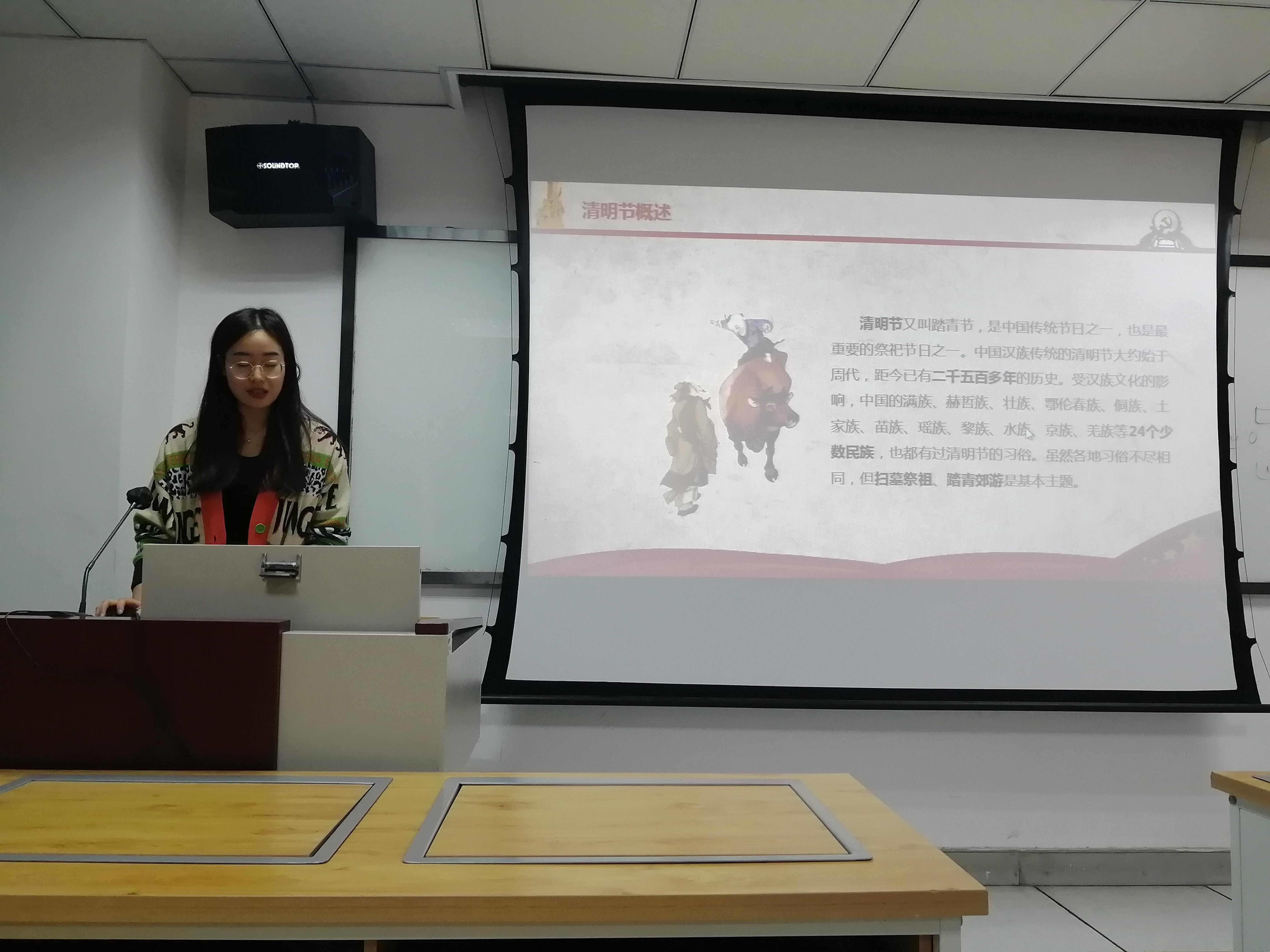 会议第一部分由迟晨晨同志为党员同志们讲述清明节的来历及革命先烈的光辉事例。清明节又叫踏青节,是中国传统节日之一,也是最重要的祭祀节日之一。中国汉族传统的清明节大约始于周代,距今已有二千五百多年的历史。受汉族文化的影响,中国的很多少数民族也都有过清明节的习俗。虽然各地习俗不尽相同,但扫墓祭祖、踏青郊游是基本主题。随后,迟晨晨同志向我们介绍了革命先烈的事迹,并带领同志们一同对牺牲的烈士和同胞们表示深切哀悼,表达了对先烈的深切缅怀和崇高敬意。