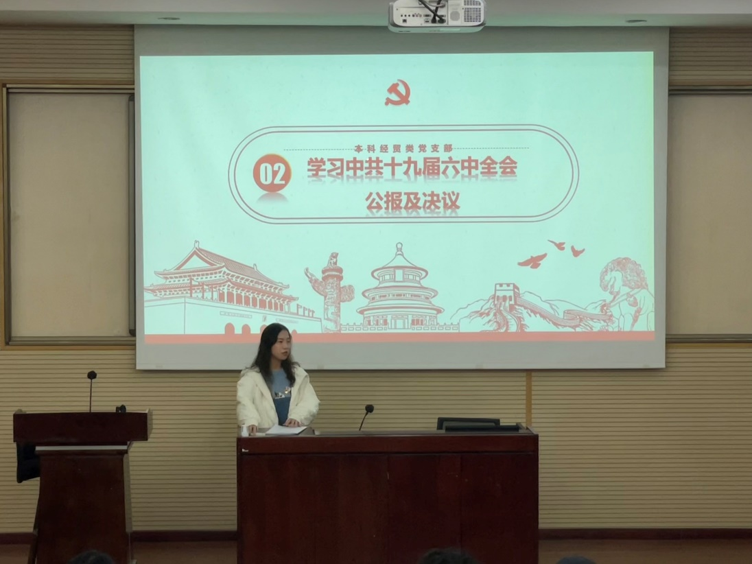 本科经贸类党支部于12月16日在J0202开展“本科经贸类党支部专题学习”,观看视频《榜样6》、学习中共十九届六中全会公报及审议通过的两个决议:《中共中央关于党的百年奋斗重大成就和历史经验的决议》和《关于召开党的第二十次代表大会的决议》,会议由党支部副书记薄慧同志主持,支部全体党员、预备党员以及积极分子共计100多人参加了支部会议。