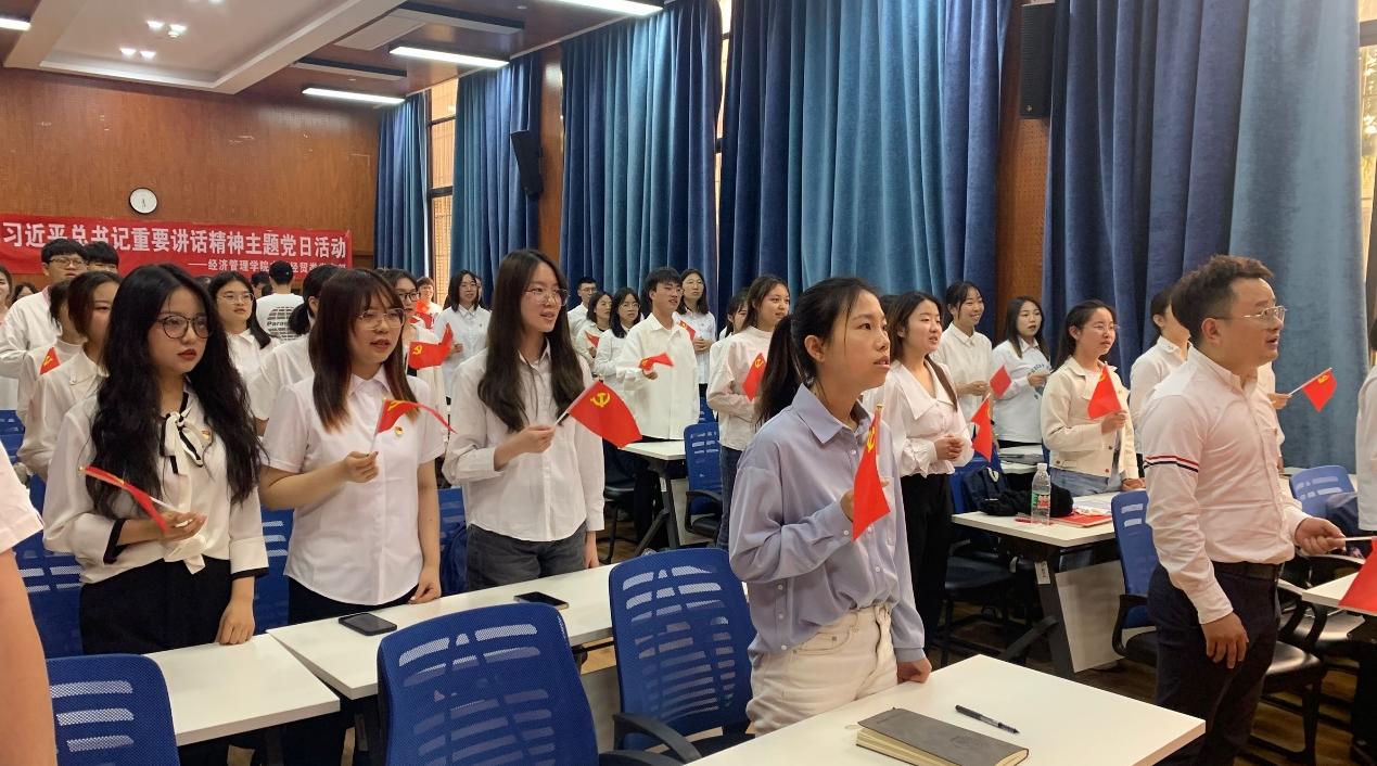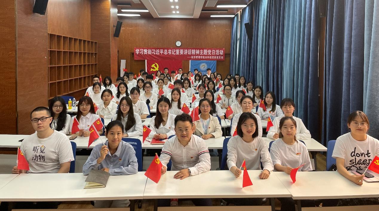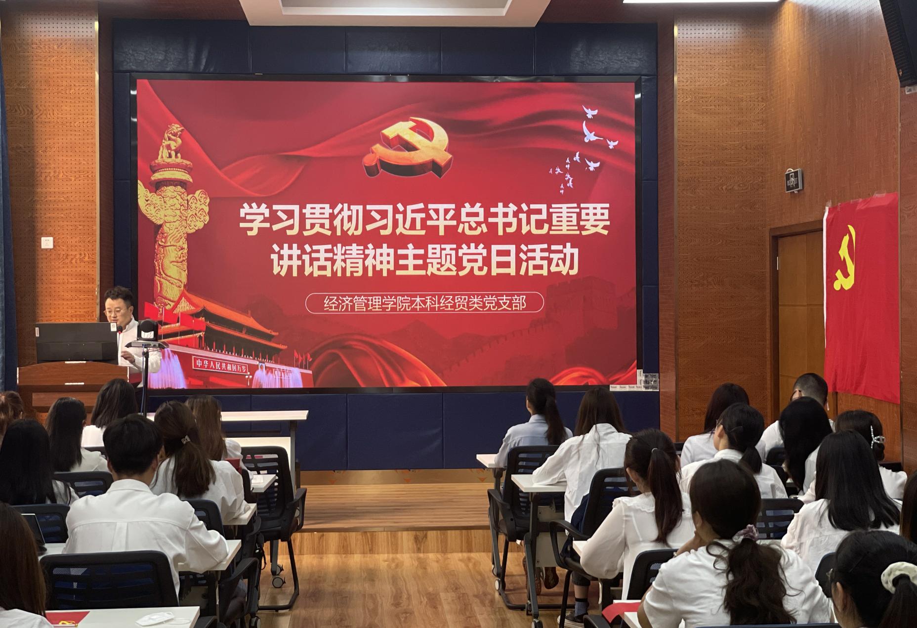 本科经贸类党支部于2022年5月19日在J0218举办了学习贯彻习近平总书记重要讲话精神主题党日活动。活动由党支部书记陈建奇主持,全体党员、本期发展对象参加了本次活动,活动分为两个部分:1、陈建奇同志领学习近平总书记重要讲话内容;2、党支部成员分享学习习近平总书记重要讲话精神心得。