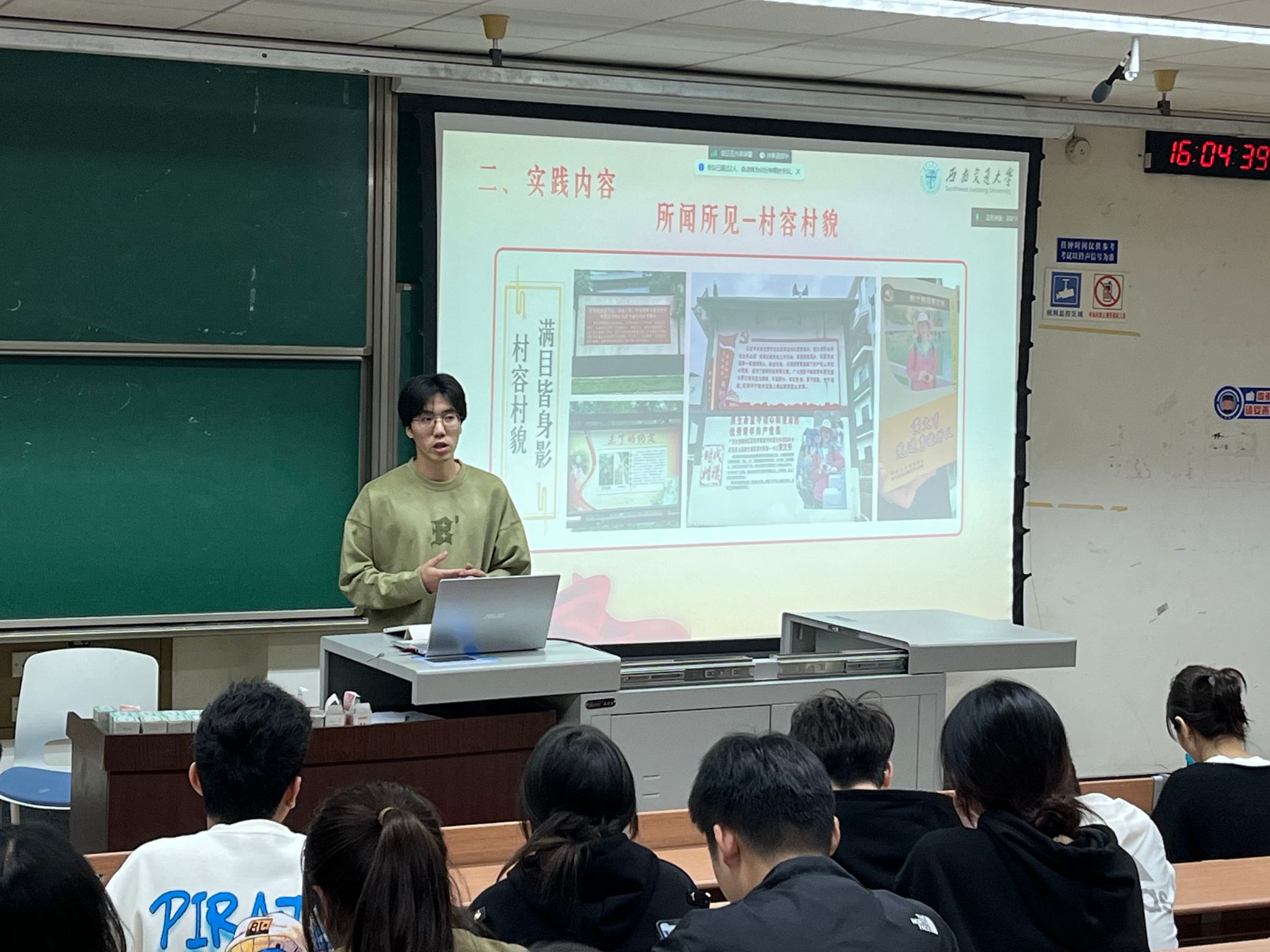赴百坭村社会实践队的汤权同志从在百坭村的见闻、文秀书记的工作事迹、文秀精神的传承等方面进行了分享。在一年的时间里,黄文秀书记通过不计其数的走访调研,找准发展方向,让百坭村焕发新生。实践队员走进文秀书记工作的地方,看到墙上村里的孩子们用稚嫩的字体写下的“文秀姐姐,我们想你了”,纷纷为之动容。汤权同对大家说,黄文秀同志一生不忘初心、执着坚守、心系村民、甘于奉献,作为新时代的接班人,我们应当学习其事迹,传承其精神,自觉扛起使命担当,在乡村振兴的道路上发光发热,将青春热血镌刻在时代的丰碑上。