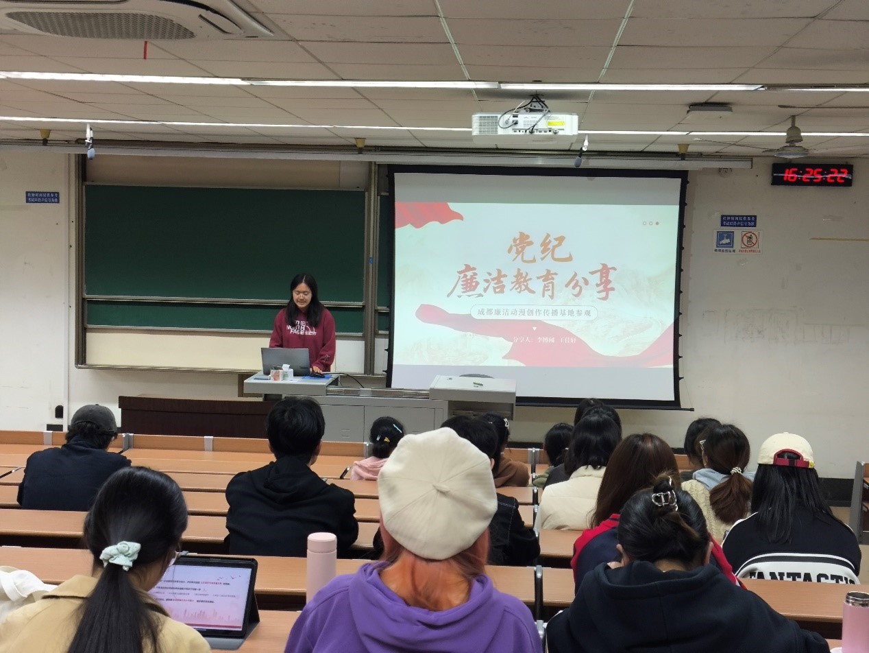 第二部分,王佳轩带领支部成员一起观看了支部原创的党纪学习教育主题视频。视频主要围绕着支部前往成都廉洁动漫基地进行党纪学习教育展开,不仅呈现了基地的历史、270°沉浸式廉洁宣传片,以及同学们参与活动等现场内容,还包含了支部成员对于党纪学习教育学习的理解。视频不仅让参与活动的同学们对党的廉洁纪律有了更深刻的认识,也让未参与活动的同学们了解到了相关内容。