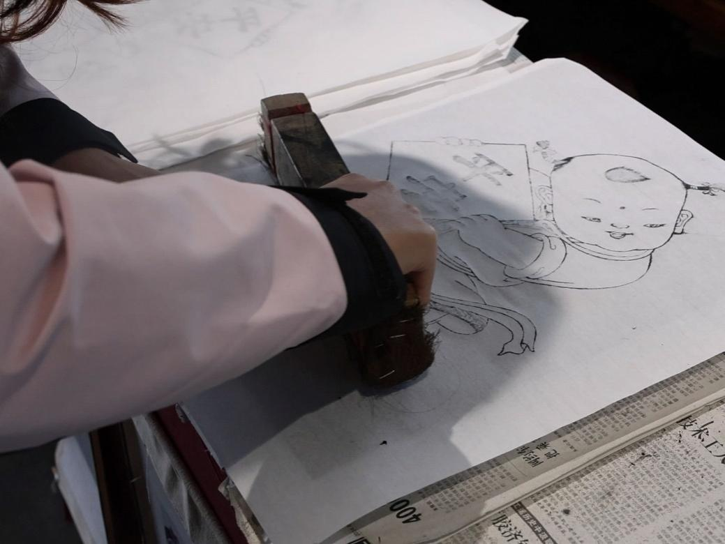 随后,队员们还亲自体验了年画的制作流程之一——印制墨线稿。首先以鬃刷蘸取烟墨,均匀涂布于木版,接着将宣纸覆于木版之上,轻压纸张形成轮廓线。而传统工艺中,艺人通过“三刷三揭”控制墨色浓淡。通过此次参观体验,队员们不仅深化了对年画这一非遗技艺的认知,也了解到传统技艺与现代设计融合的新路径,为后续实践奠定了重要基础。