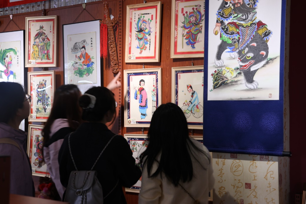 该队伍首先到达绵竹年画展示馆参观体验,馆内大厅集中展示了各种形式的年画作品及其衍生产品,形式包括拓片、绣品、木板、泥塑等。馆内的年画展区通过光影技术与实物陈列相结合的方式,展示了驱邪纳福、祈福禳灾、历史故事、民间传说等各类题材的年画。在衍生品展区,队员们驻足欣赏了融合年画元素的文创产品,包括蜀绣工艺制作的年画、立体年画摆件等30余类创新产品。