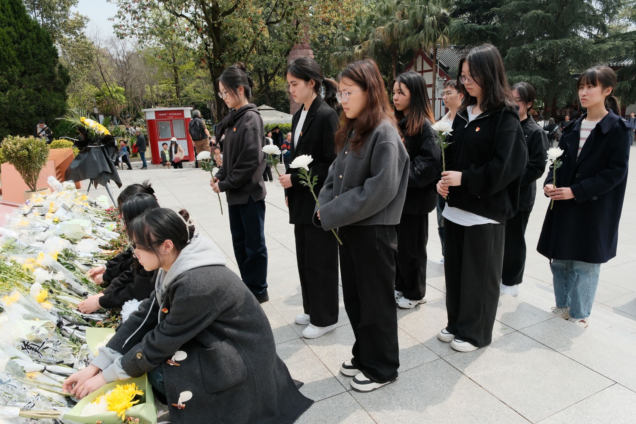 松柏苍翠映忠骨,白菊素雅寄哀思。当日下午1时30分,全体人员肃立于烈士纪念碑前。苍松垂首,丰碑无言,春风中飘扬的党旗与白菊交织成肃穆的画卷。活动在庄重的鲜花默哀仪式中徐徐展开,大家缓缓走向烈士墓,献上手中白菊,深深三鞠躬,一朵朵绽放的菊花,寄托着对革命先辈的深切追思。随后,大家低头默哀,时间仿佛凝固,每一秒都承载着对先烈们的深切缅怀,空气中弥漫着庄重与敬仰。