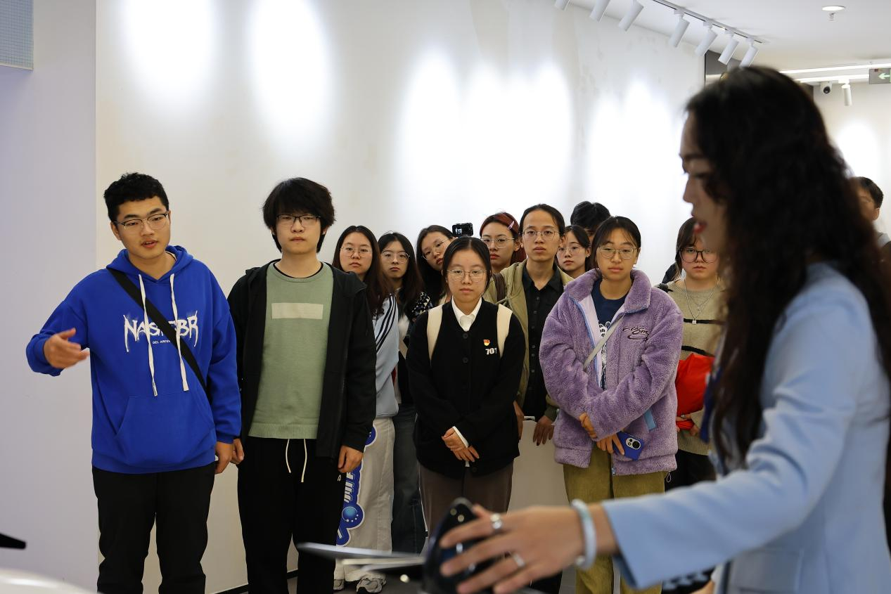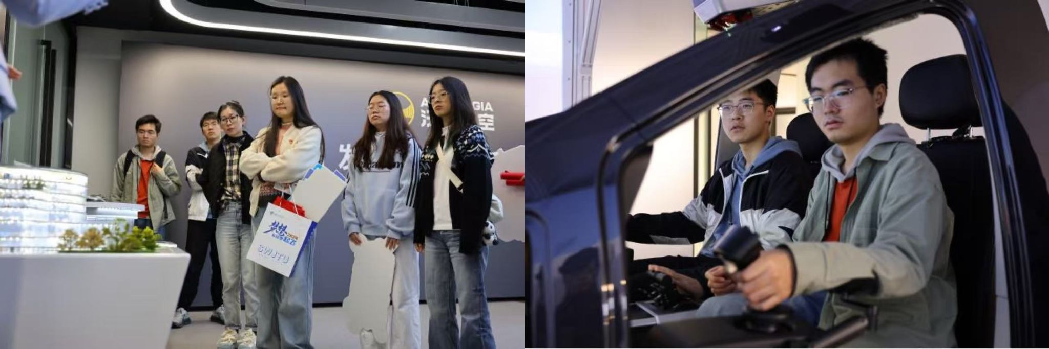 首先,师生们跟随讲解员走进企业产品展示空间,系统了解eVTOL(电动垂直起降飞行器)从2016年太力飞行汽车到核心产品AE200的发展历程。秉持“创造可信赖、可持续的美好低空出行”使命,沃飞长空持续推动技术突破,与抗战时期“敢闯无人区、敢破硬难关”的精神一脉相承。通过参观AE200客舱模型及体验模拟试驾,同学们切身感受到科技攻坚的力量与低空出行的便捷前景。