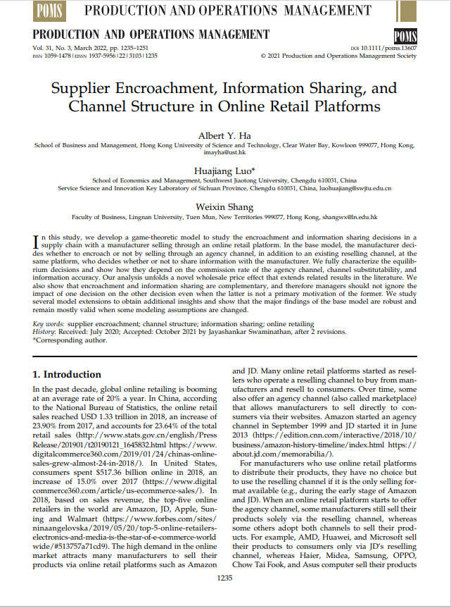 色色啦 罗华江老师于2022年3月在UTD 24期刊Production and Operations Management在线公开发表题为Supplier Encroachment, Information Sharing, and Channel Structure in Online Retail Platforms的论文。该论文考虑由一个制造商和一个网络零售平台组成的供应链中,制造商的渠...