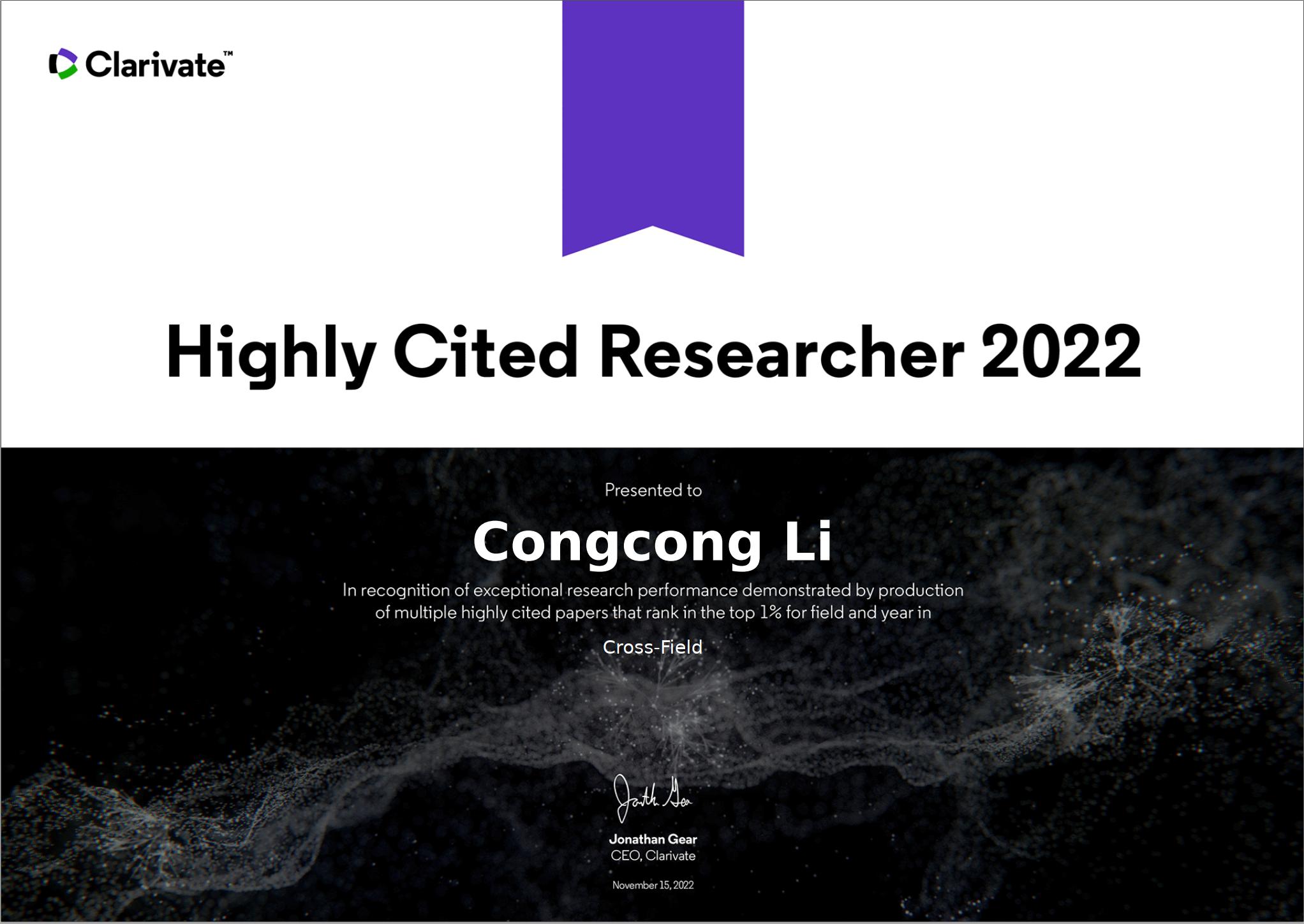 【科研】热烈祝贺我院李聪聪老师入选2022全球高被引科学家榜单